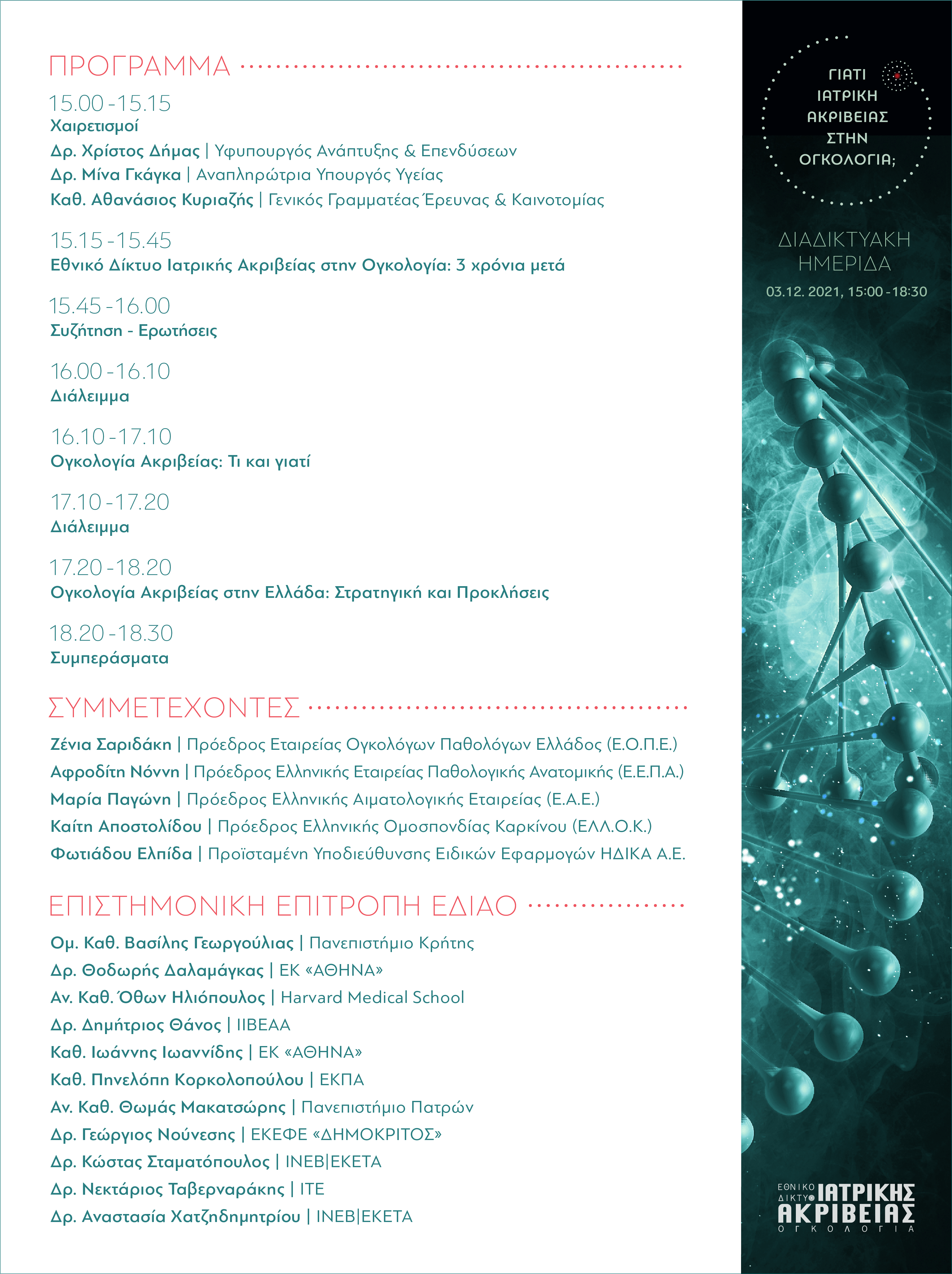 Σκοπός της διαδικτυακής ημερίδας είναι η παρουσίαση και αποτίμηση των αποτελεσμάτων της Εμβληματικής Δράσης «Εθνικό Δίκτυο Ιατρικής Ακριβείας» και η αναφορά στις προοπτικές του για το μέλλον.
