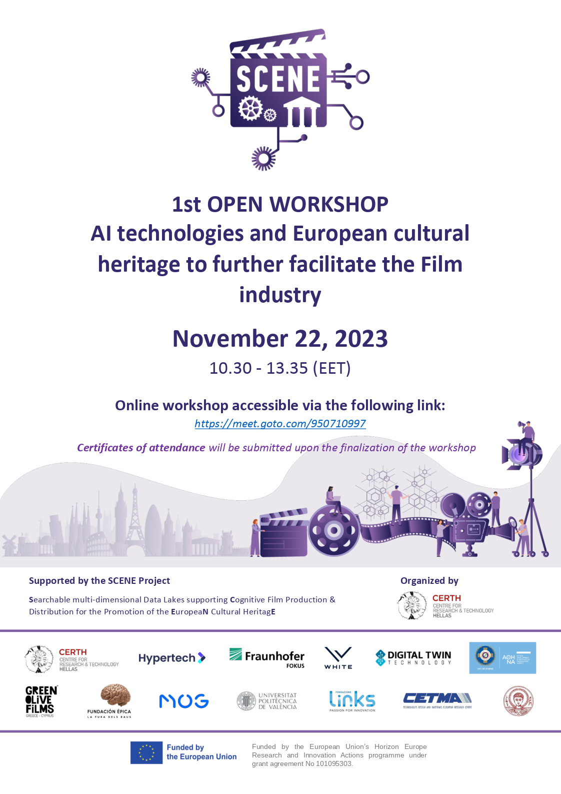 Το ερευνητικό έργο SCENE που συντονίζεται από το Εθνικό Κέντρο Έρευνας και Τεχνολογικής Ανάπτυξης στο πλαίσιο του Horizon 2020 Culture, creativity and inclusive society διοργανώνει online εργαστήριο με βασικό άξονα την παραπάνω πρόκληση. Συγκεκριμένα, το έργο SCENE στοχεύει στην εκσυγχρονισμό της ευρωπαϊκής βιομηχανίας του κινηματογράφου μέσω της χρήσης τεχνολογιών τεχνητής νοημοσύνης (Artificial Intelligence (AI)), ενισχύοντας την παγκόσμια ανταγωνιστικότητα καθώς και την προώθηση της ευρωπαϊκής πολιτιστικής κληρονομιάς κάνοντας χρήση της φωτογραμμετρίας, της ψηφιακής 3Δ ανακατασκευής και της εικονικής πραγματικότητας.