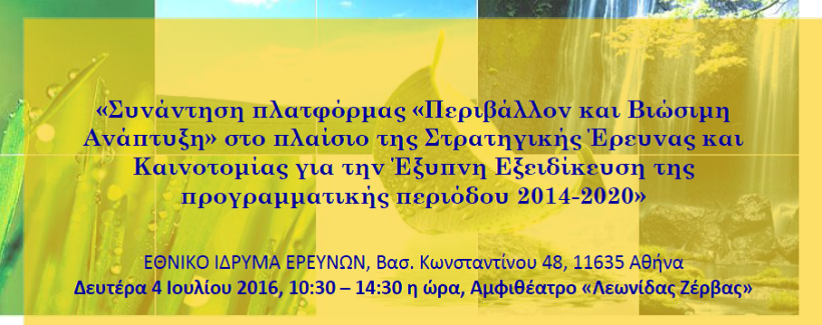 Συνάντηση πλατφόρμας «Περιβάλλον και Βιώσιμη Ανάπτυξη» στο πλαίσιο της Στρατηγικής Έρευνας και Καινοτομίας για την Έξυπνη Εξειδίκευση της προγραμματικής περιόδου 2014-2020»