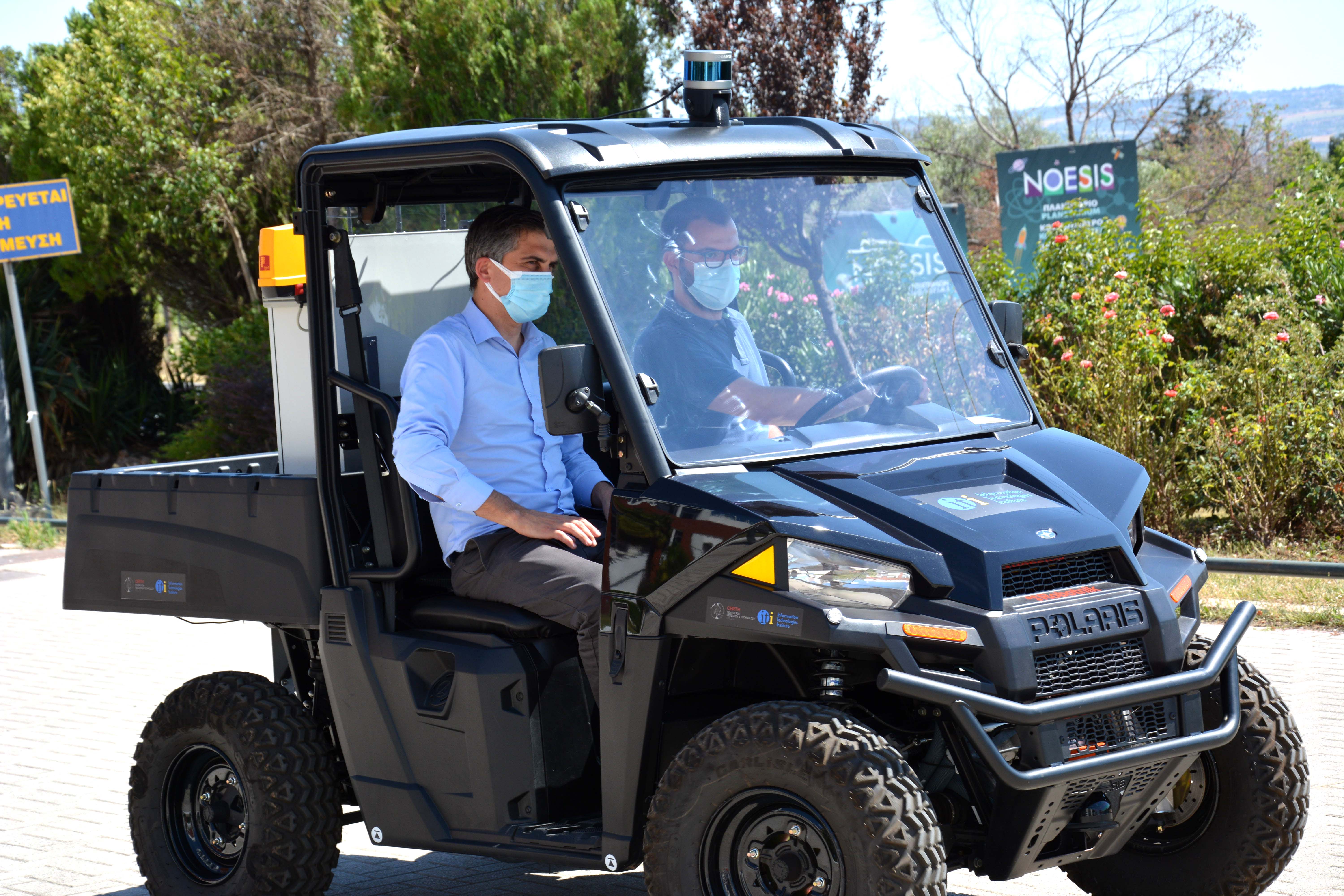 Κατά τη διάρκεια της συνάντησης, ο κ. Δήμας ενημερώθηκε τόσο για την ερευνητική όσο και επιχειρηματική δραστηριότητα του Κέντρου, όπως αυτή αποτυπώνεται μέσα από την ανάληψη και διεκπεραίωση μεγάλων ερευνητικών προγραμμάτων αλλά και μέσα από την σημαντική οικονομική δραστηριότητα, που καταγράφουν οι έως σήμερα 15 spin-off εταιρίες του. Στη συνέχεια, ο κ. Δήμας έφτασε με το αυτοκινούμενο όχημα του ΕΚΕΤΑ | ΙΠΤΗΛ στα Ινστιτούτα του Κέντρου όπου και ξεναγήθηκε παρουσία των Διευθυντών και του Προέδρου του ΕΚΕΤΑ και ενημερώθηκε από κοντά για τα τεχνολογικά τους επιτεύγματα.