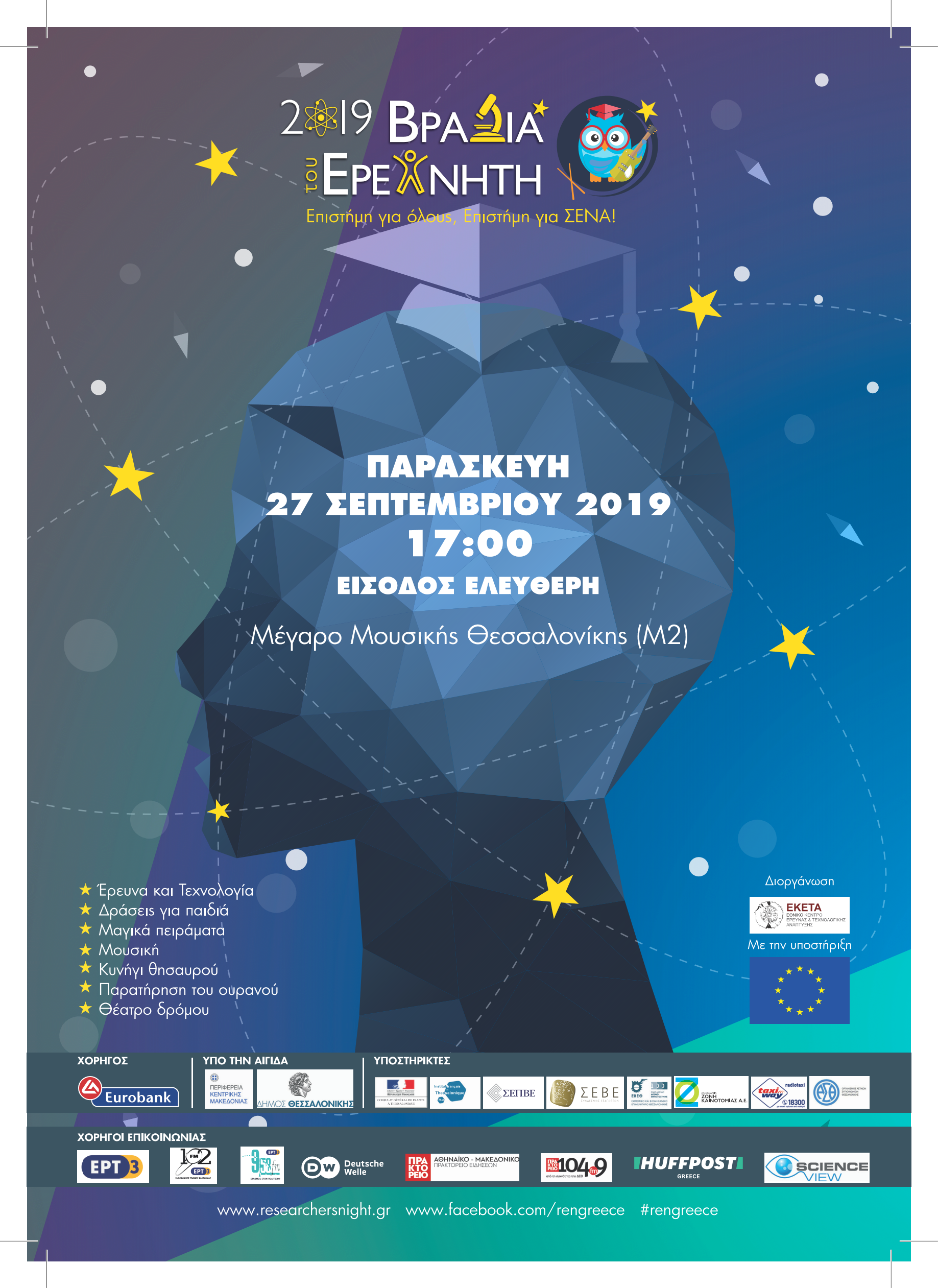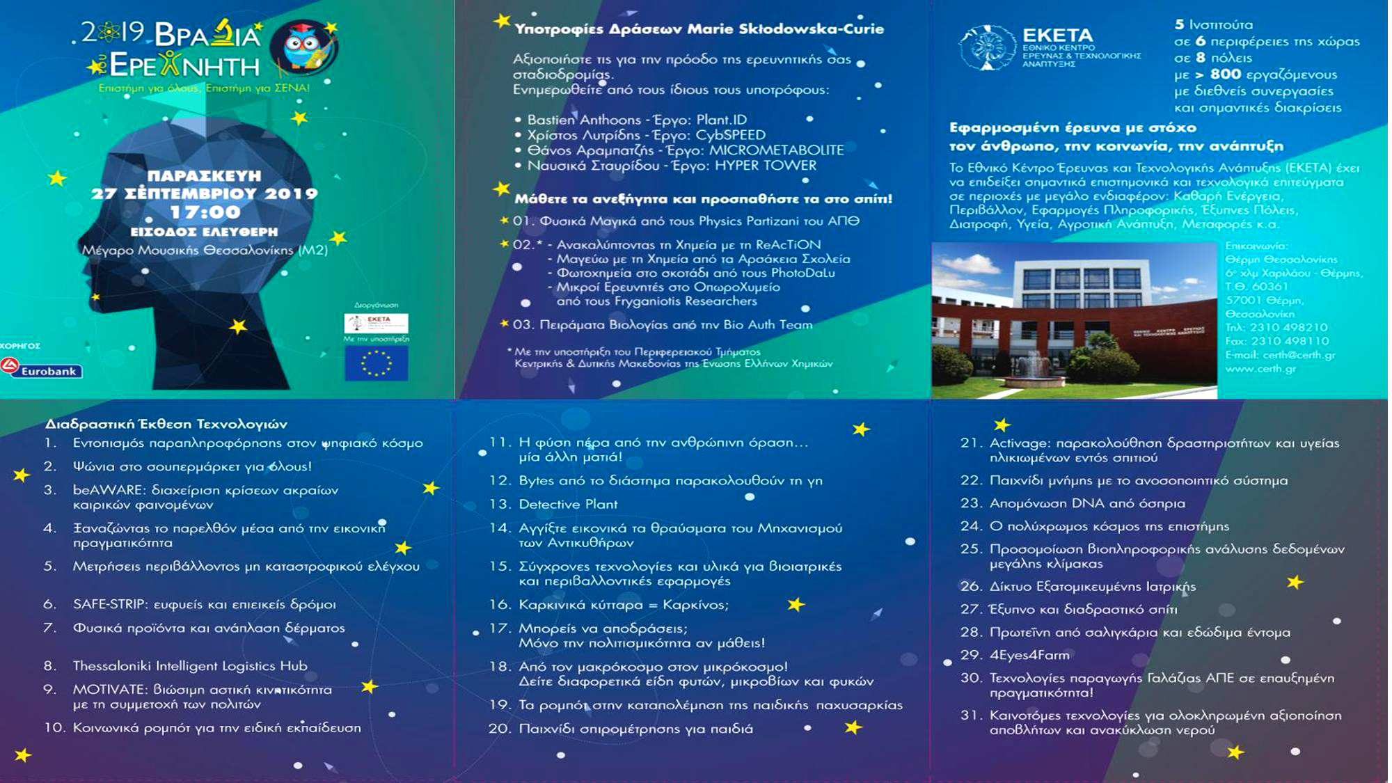 Για μία ακόμη χρονιά το Εθνικό Κέντρο Έρευνας και Τεχνολογικής Ανάπτυξης (ΕΚΕΤΑ) διοργανώνει τη Βραδιά του Ερευνητή την Παρασκευή 27 Σεπτεμβρίου 2019 και σας προσκαλεί στο Μέγαρο Μουσικής Θεσσαλονίκης (κτίριο Μ2) προκειμένου να ζήσετε μία ξεχωριστή Βραδιά γεμάτη έρευνα, επιστημονικά πειράματα, καλλιτεχνικά δρώμενα και μουσική. Η Βραδιά του Ερευνητή θα ανοίξει τις πύλες της στις 17:00.