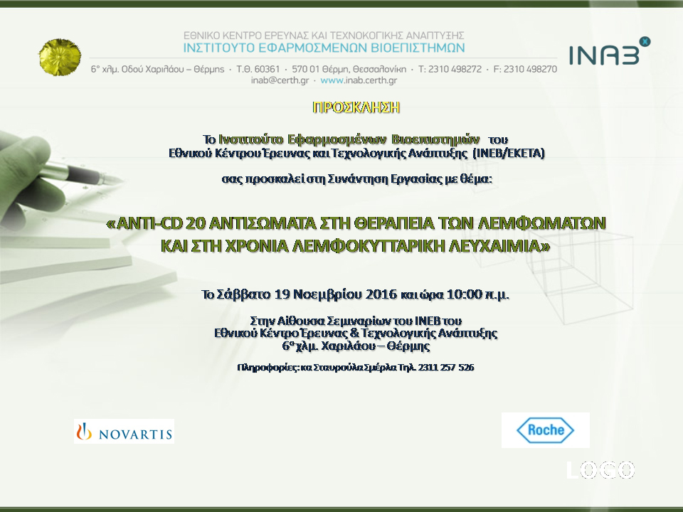 Παρακολουθείστε ζωντανά την επιστημονική ημερίδα του Ινστιτούτου Εφαρμοσμένων Βιοεπιστημών (ΙΝ.Ε.Β.) του Εθνικού Κέντρου Έρευνας και Τεχνολογικής Ανάπτυξης (Ε.Κ.Ε.Τ.Α.): www.livemedia.gr/xll16