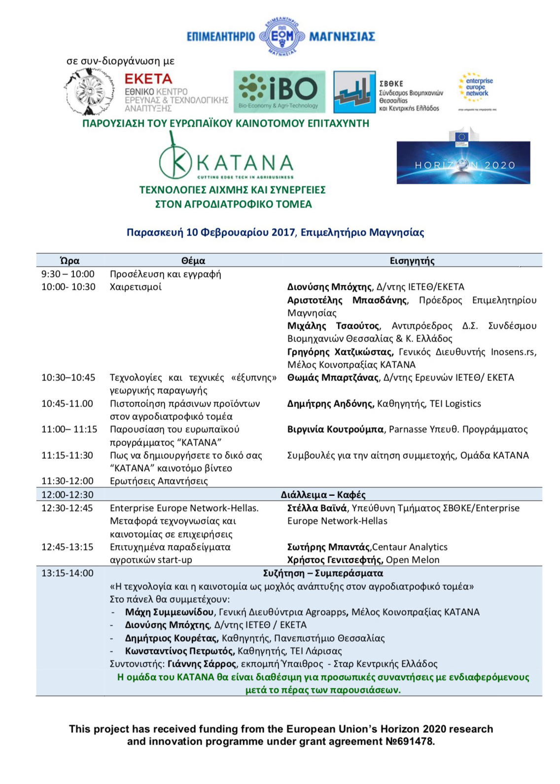 Το Επιμελητήριο Μαγνησίας σε συν-διοργάνωση με το Εθνικό Κέντρο Έρευνας και Τεχνολογικής Ανάπτυξης (ΕΚΕΤΑ), το σύνδεσμο Βιομηχανιών Θεσσαλίας και Κεντρικής Ελλάδος και το Enterprise Europe Network σας προσκαλεί στην παρουσίαση του «ΚΑΤΑΝΑ».