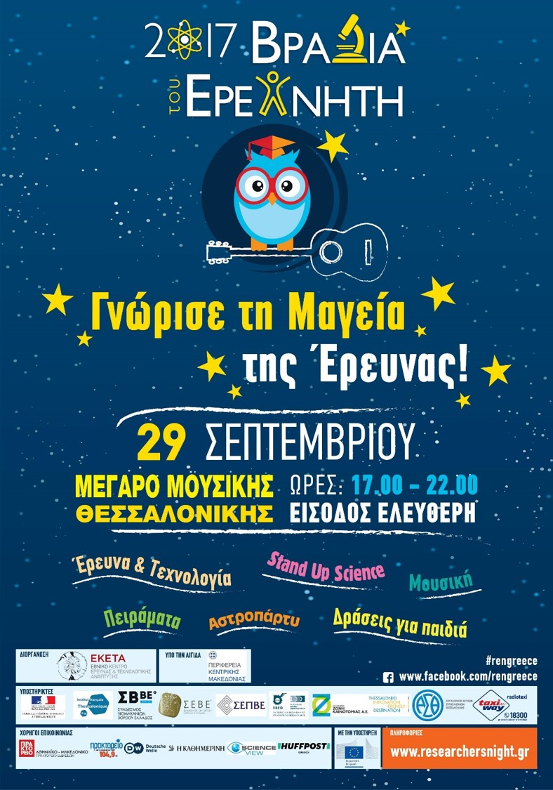 Το Εθνικό Κέντρο Έρευνας και Τεχνολογικής Ανάπτυξης (ΕΚΕΤΑ), συντονίζει για ακόμη μια χρονιά τη Βραδιά του Ερευνητή στη Θεσσαλονίκη και σας προσκαλεί την Παρασκευή, 29 Σεπτεμβρίου 2017 να επισκεφθείτε το Μέγαρο Μουσικής Θεσσαλονίκης (κτίριο Μ1) για να ζήσετε μια μοναδική βραδιά γεμάτη έρευνα, διαδραστικά επιστημονικά πειράματα και μουσική. Η εκδήλωση θα ξεκινήσει στις 17.00, οπότε και η Βραδιά του Ερευνητή θα ανοίξει τις πύλες της σε επισκέπτες όλων των ηλικιών.