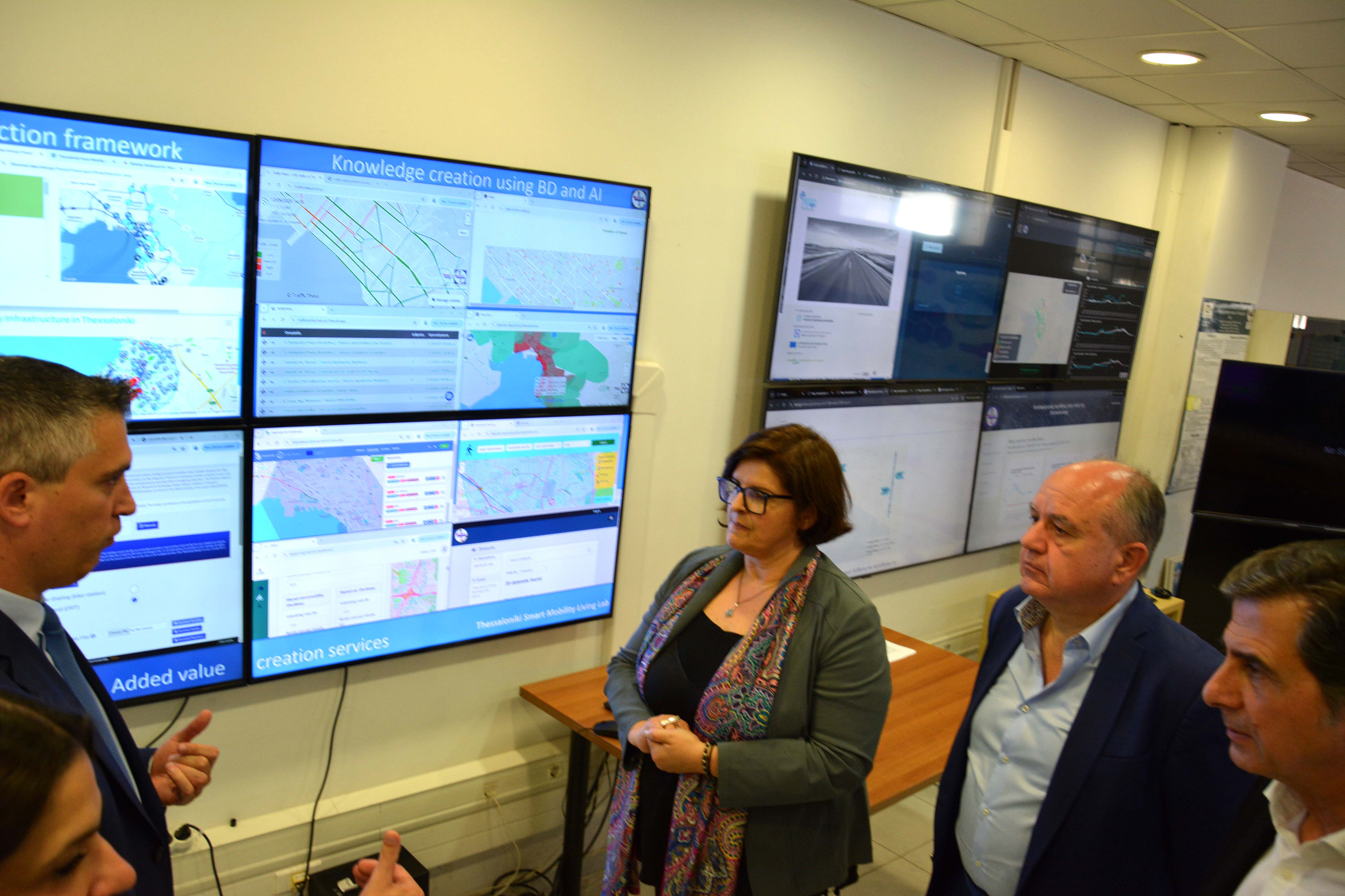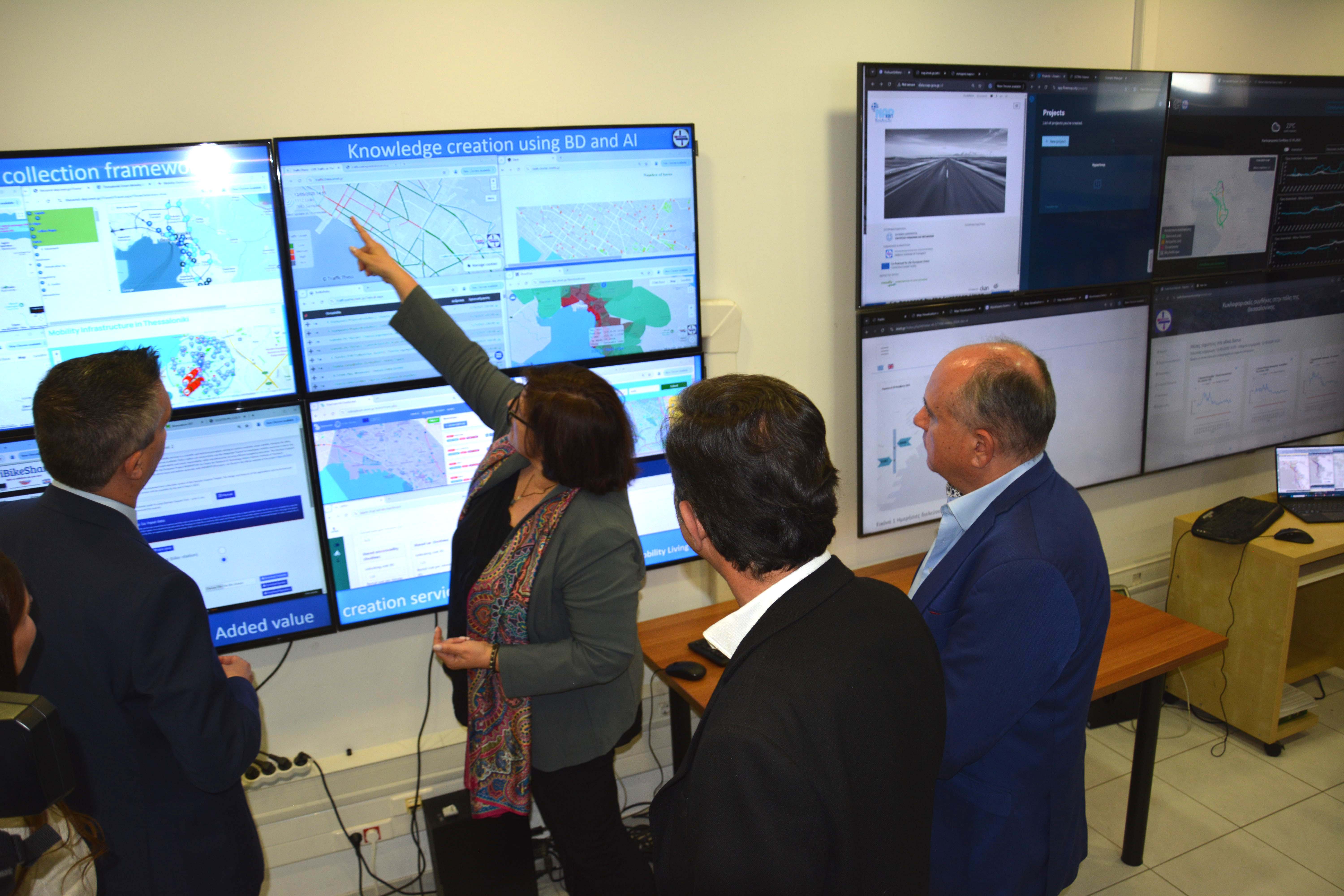 Πιο συγκεκριμένα, ο κ. Δήμας επισκέφθηκε το Ζωντανό Εργαστήριο Έξυπνης Κινητικότητας, όπου ενημερώθηκε από τη Διευθύντρια Ερευνών Δρ. Γεωργία Αϋφαντοπούλου για εφαρμογές βιώσιμης κινητικότητας βασισμένες σε δεδομένα πραγματικού χρόνου και μεγάλου όγκου. Μεταξύ άλλων, παρουσιάστηκαν τα θετικά αποτελέσματα από τη λειτουργία του μετρό στη Θεσσαλονίκη, με μείωση της κυκλοφορίας κατά 14%, καθώς και το σύστημα ενημέρωσης πολιτών για το flyover, το οποίο παρέχεται δωρεάν σε 10000-150000 πολίτες καθημερινά και σε 600000 μοναδικούς χρήστες ανά έτος (https://flyover.imet.gr/). Ιδιαίτερο ενδιαφέρον προκάλεσαν το σύστημα τεχνητής νοημοσύνης για την έξυπνη διαχείριση σηματοδότησης ανάλογα με τις κυκλοφοριακές συνθήκες, καθώς και η πλατφόρμα ENIGMA που παρακολουθεί εκπομπές CO₂ και αποδίδει επιπτώσεις σε κάθε περιοχή της πόλης. Ο κ. Δήμας παράλληλα έδειξε ενδιαφέρον για τις συνθήκες δημιουργίας των «πόλεων των 15 λεπτών» και τους τρόπους υλοποίησής τους.