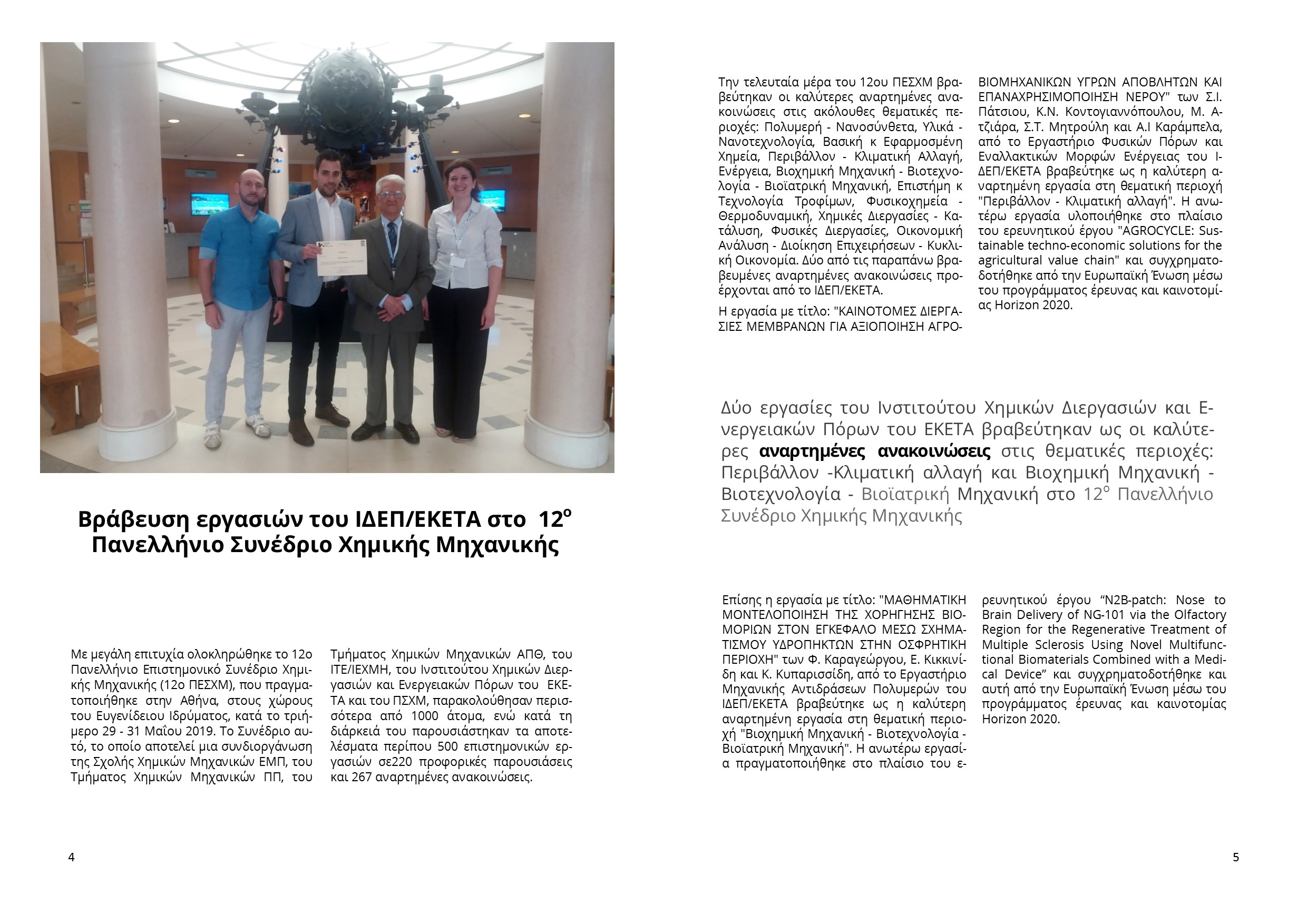 Δύο εργασίες του Ινστιτούτου Χημικών Διεργασιών και Ενεργειακών Πόρων του ΕΚΕΤΑ βραβεύτηκαν στις θεματικές περιοχές «Περιβάλλον-Κλιματική αλλαγή» και «Βιοχημική Μηχανική - Βιοτεχνολογία - Βιοϊατρική Μηχανική» στο 12ο Πανελλήνιο Συνέδριο Χημικής Μηχανικής