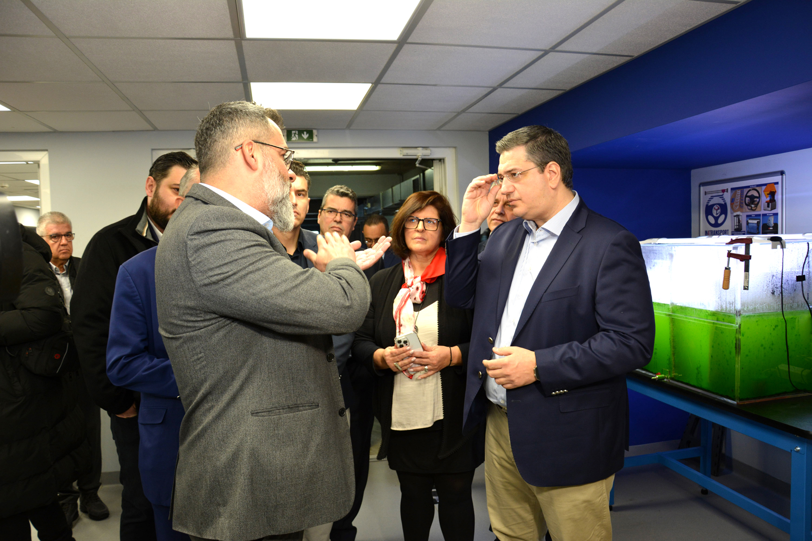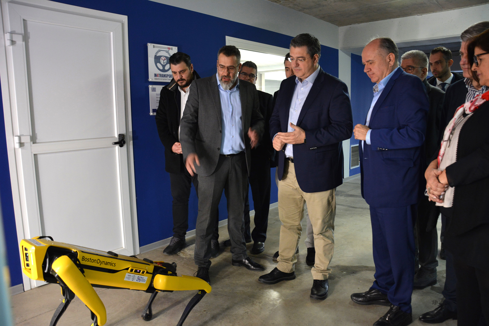 Έπειτα στο Fab Lab, ο Δρ. Β. Καππάτος, Διευθυντής Ερευνών του ΕΚΕΤΑ|ΙΜΕΤ, ενημέρωσε τον Επίτροπο για την έρευνα που διεξάγεται εκεί. Αρχικά, πραγματοποιήθηκε επίδειξη του τετράποδου ρομπότ «Κύων», το οποίο χρησιμοποιείται για την επιθεώρηση υποδομών μεταφορών και παρουσιάστηκαν συστήματα υπερήχων, που χρησιμοποιούνται τόσο για την εμπόδιση της δημιουργίας πάγου στα αεροπλάνα όσο για τον αυτόματο καθαρισμό των κέλυφων των πλοίων.