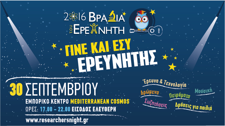 Η «Βραδιά του Ερευνητή» διοργανώνεται από το Εθνικό Κέντρο Έρευνας και Τεχνολογικής Ανάπτυξης (EKETA) στο Εμπορικό Κέντρο Mediterranean Cosmos με ώρα έναρξης στις 17:00 και Ελεύθερη Είσοδο