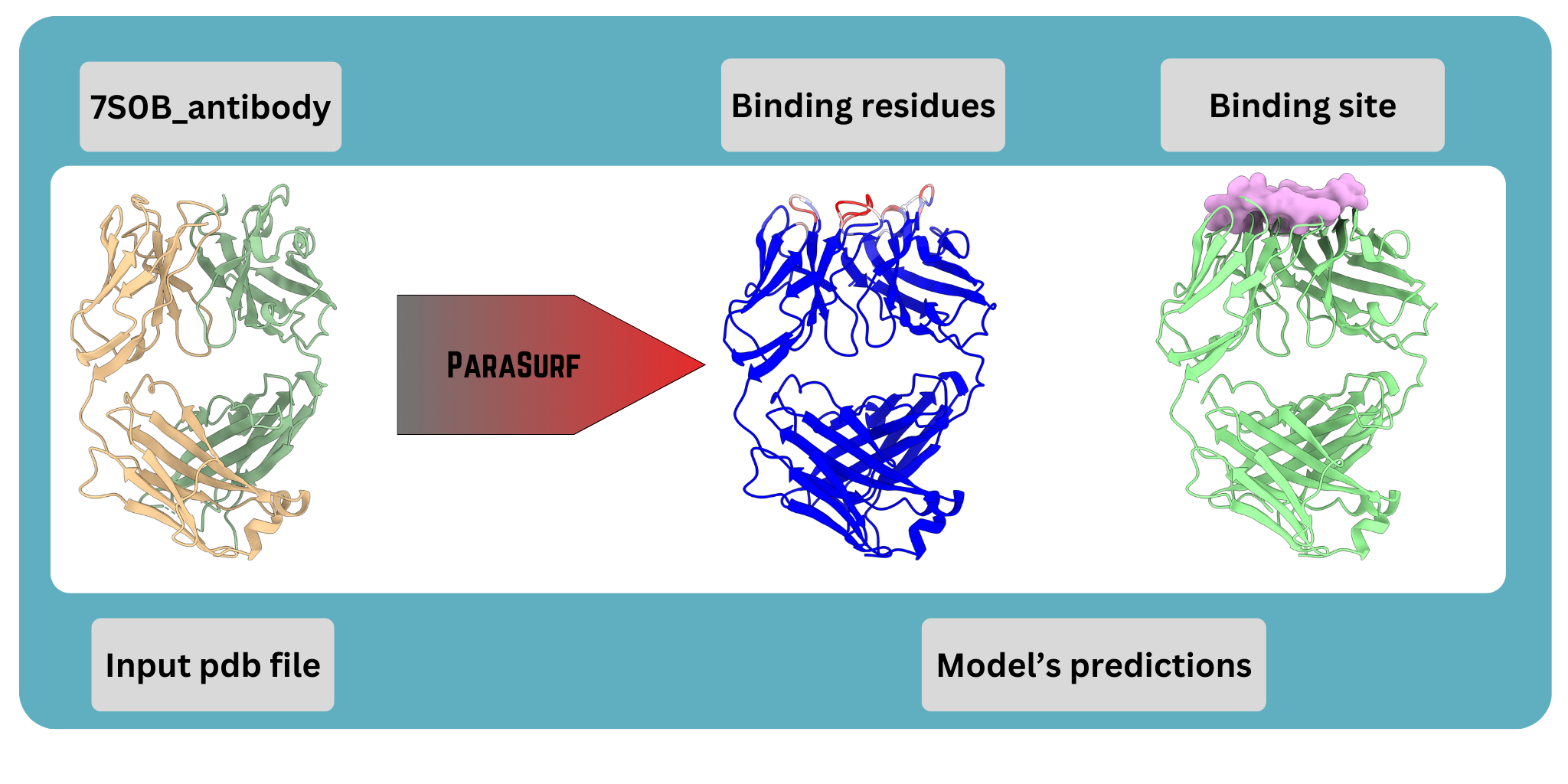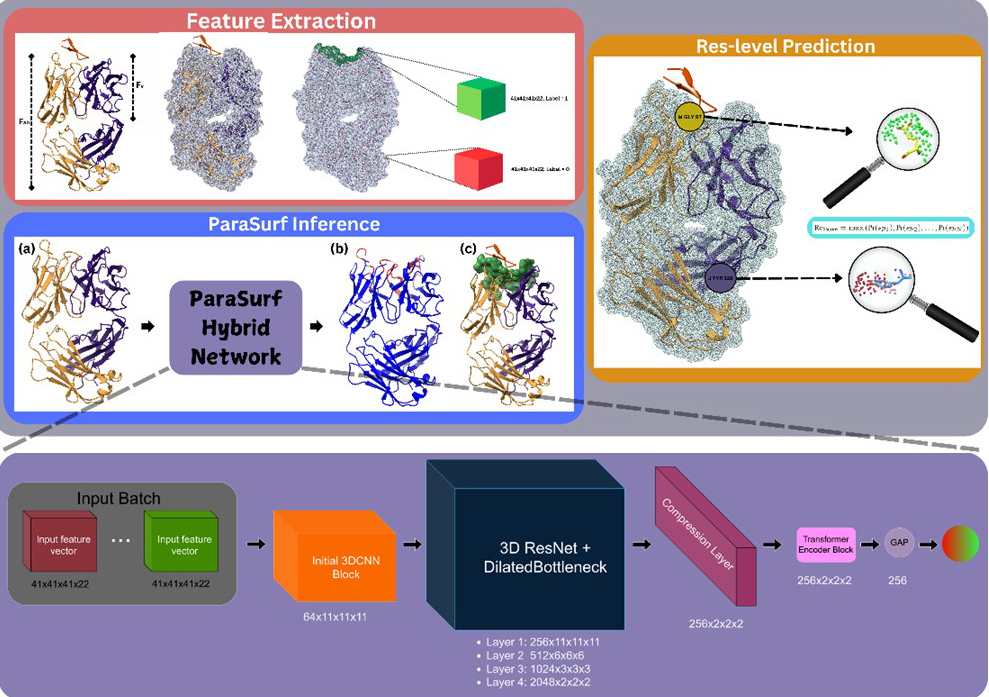 Ειδικότερα, το ParaSurf προβλέπει τις θέσεις δέσμευσης των αντισωμάτων αναλύοντας τα χαρακτηριστικά της μοριακής επιφάνειας, συμπεριλαμβανομένων γεωμετρικών, χημικών και ηλεκτροστατικών ιδιοτήτων. Αυτά τα χαρακτηριστικά χρησιμοποιούνται για την εκπαίδευση ενός υβριδικού βαθιού νευρωνικού δικτύου που συνδυάζει ένα 3D ResNet με ένα transformer.
