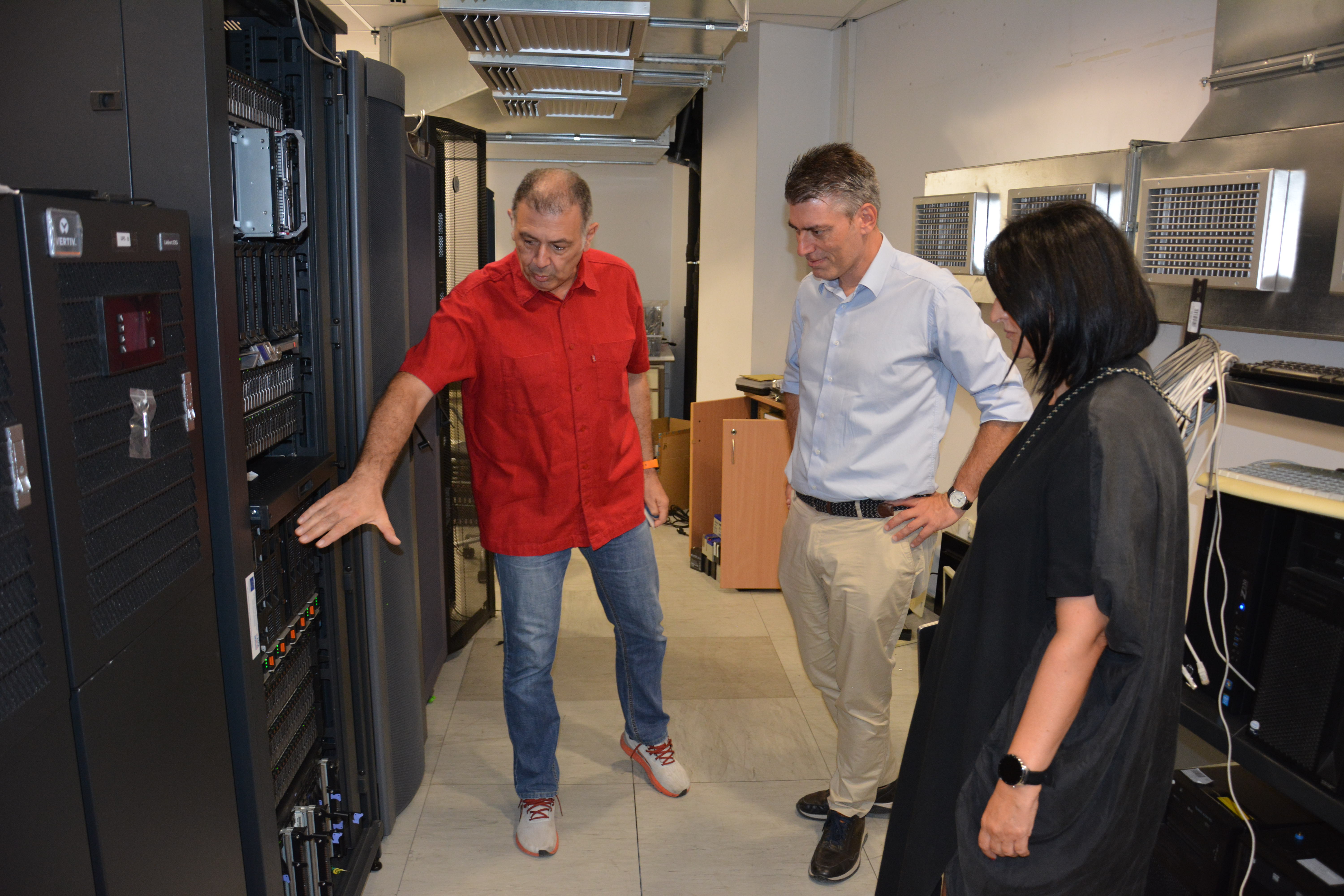 Στη συνέχεια, στο Ινστιτούτο Εφαρμοσμένων Βιοεπιστημών (ΙΝΕΒ), ο κ. Γαϊτάνης, επισκέφθηκε το Εργαστήριο Γενετικής Ανάλυσης όπου και ενημερώθηκε για τις κλινικές μελέτες που διεξάγονται σε συνεργασία με τη φαρμακοβιομηχανία και τις διαπιστεύσεις του Ινστιτούτου στη βιοανάλυση. Αμέσως μετά βρέθηκε στην Υπολογιστική Υποδομή του ΙΝΕΒ για την ανάλυση Μεγάλου Όγκου Βιοδεδομένων, που υποστηρίζει πολυκεντρικές διεθνείς και γενωμικες μελέτες με απολυτή ασφάλεια.