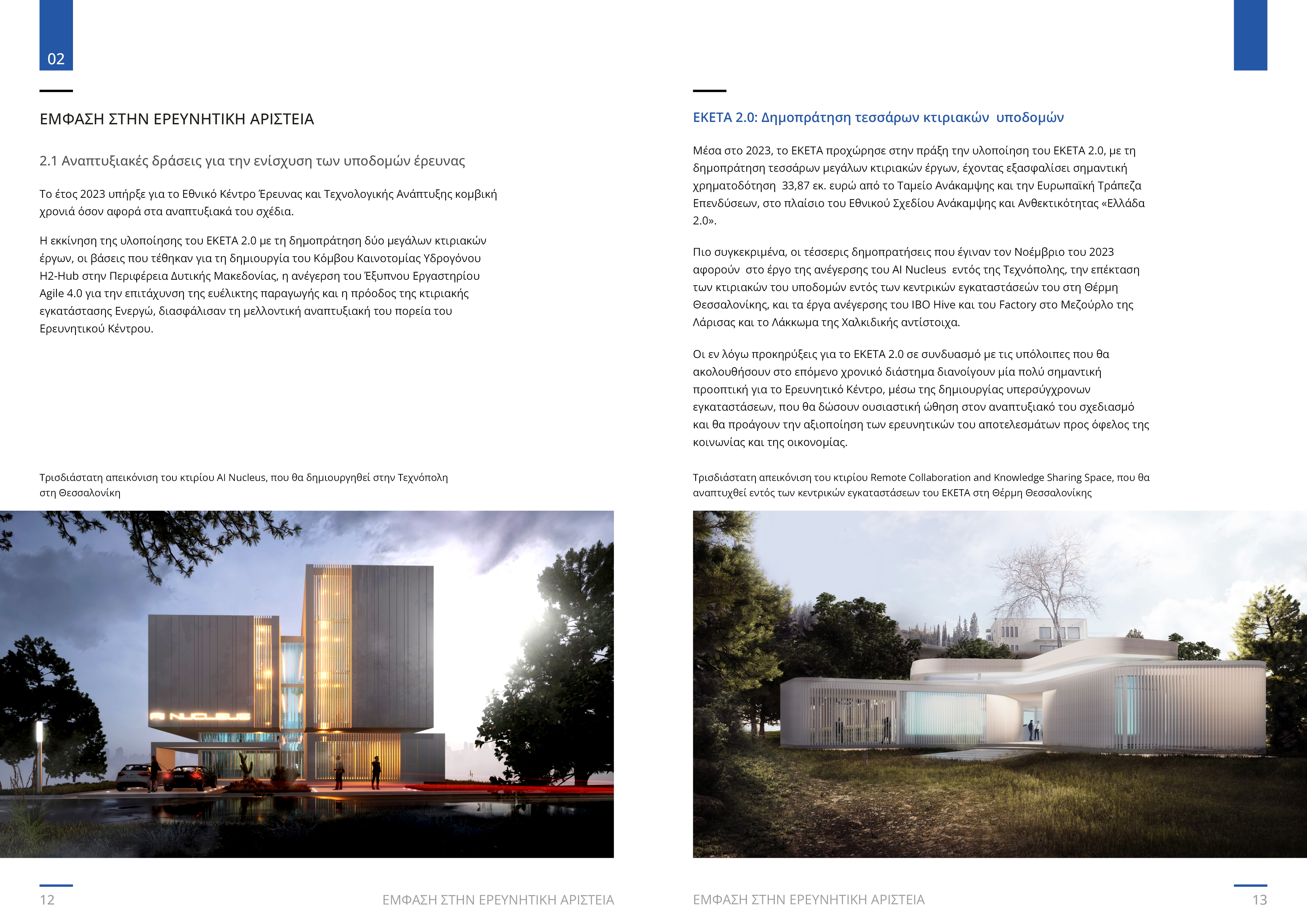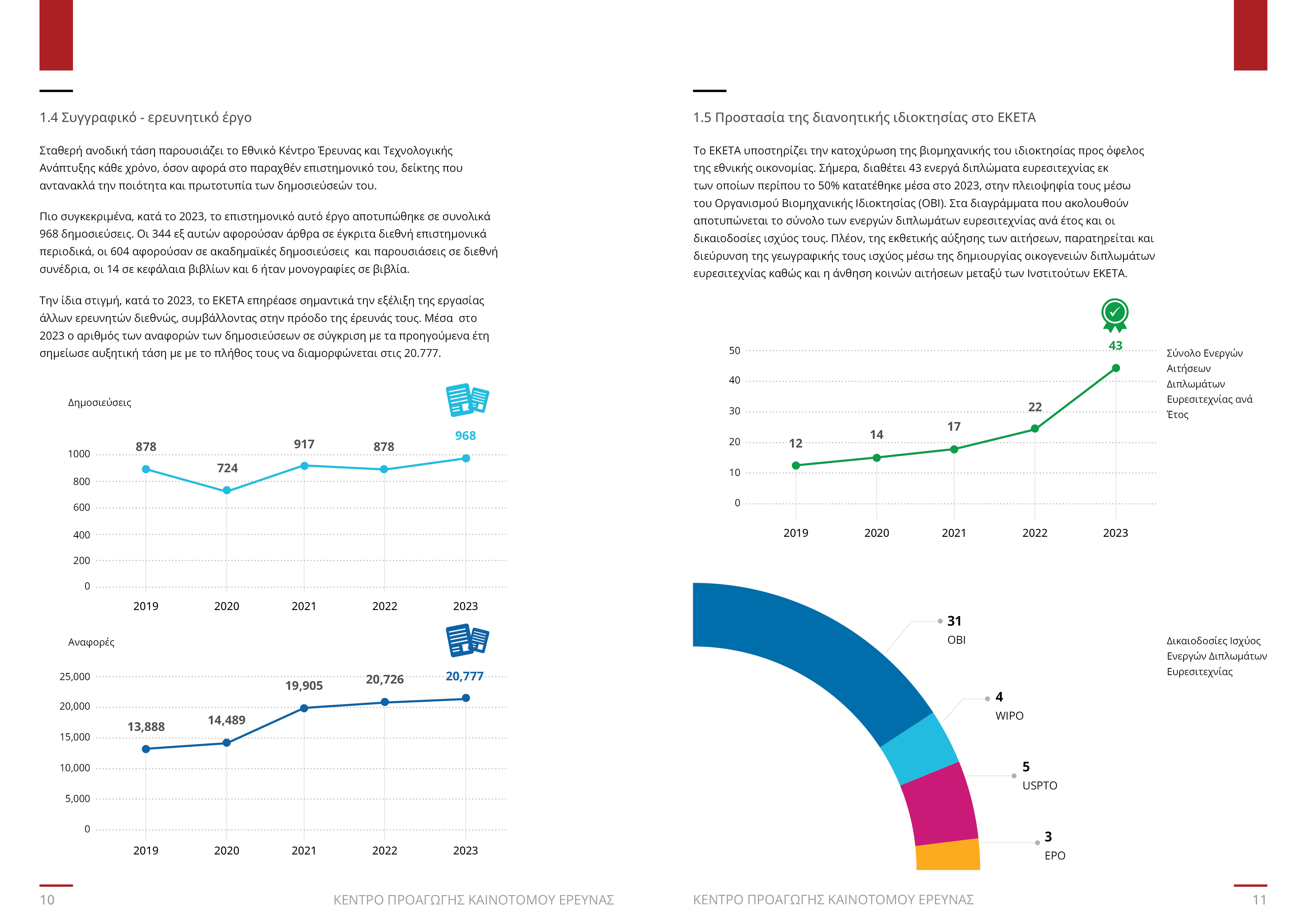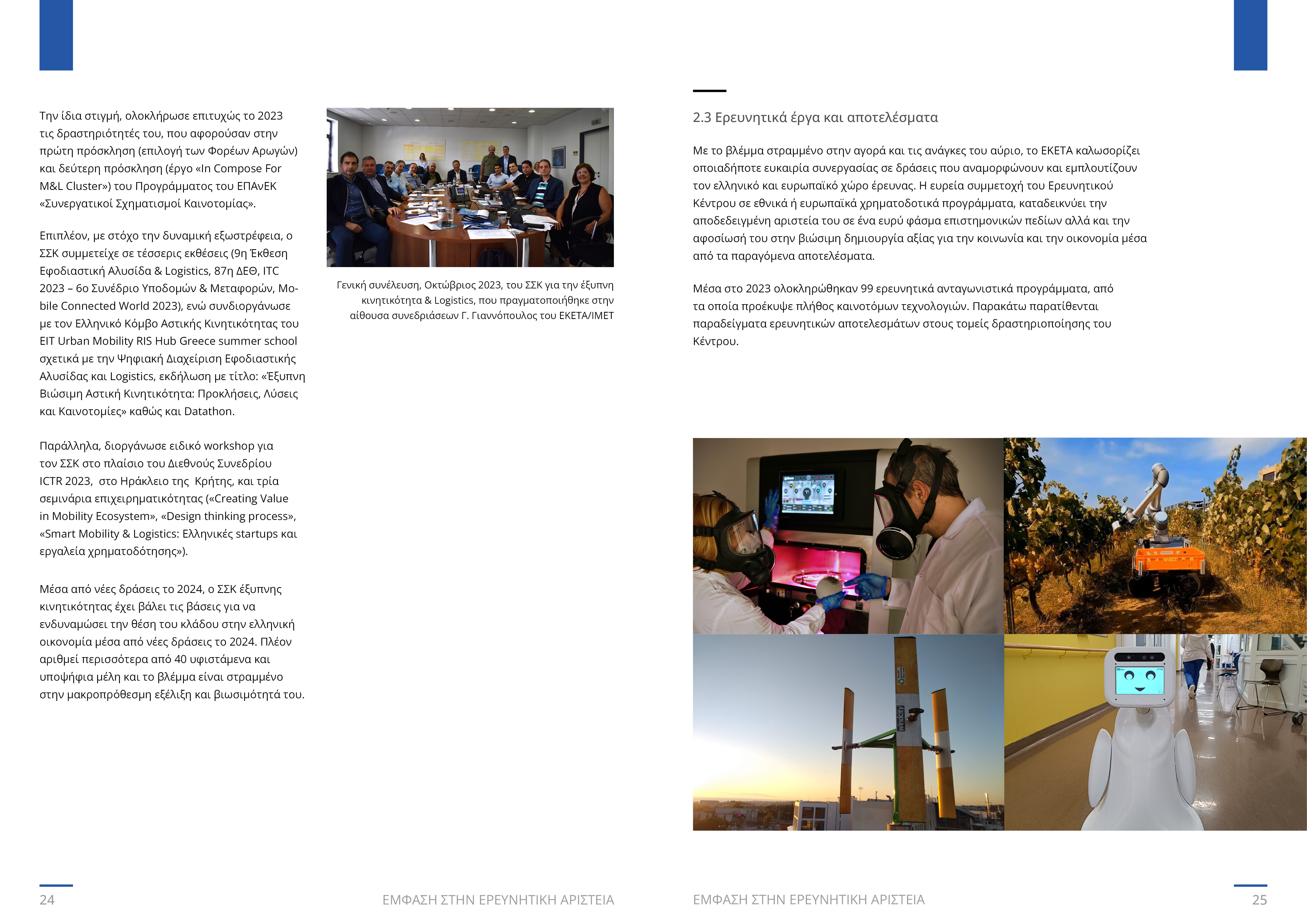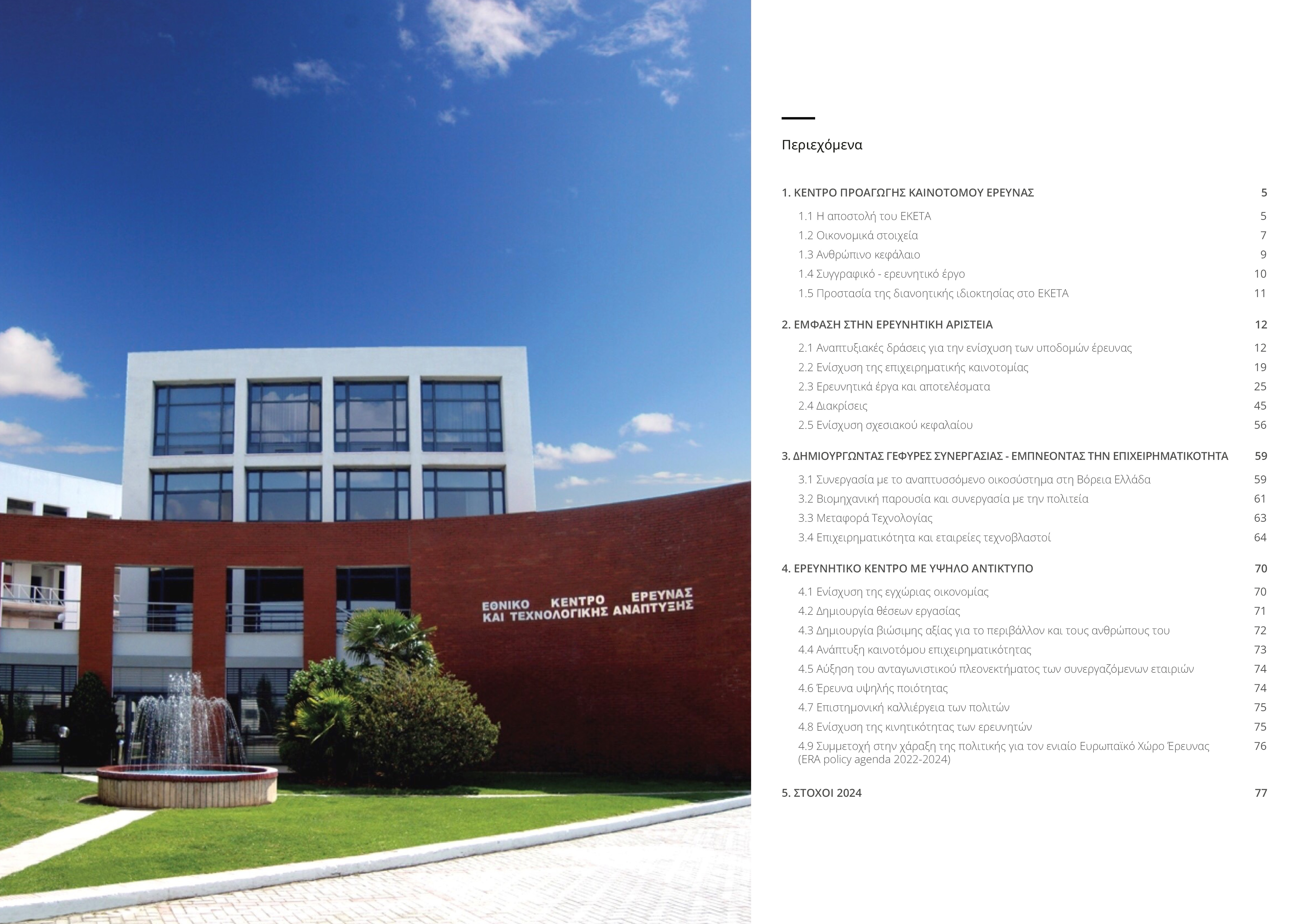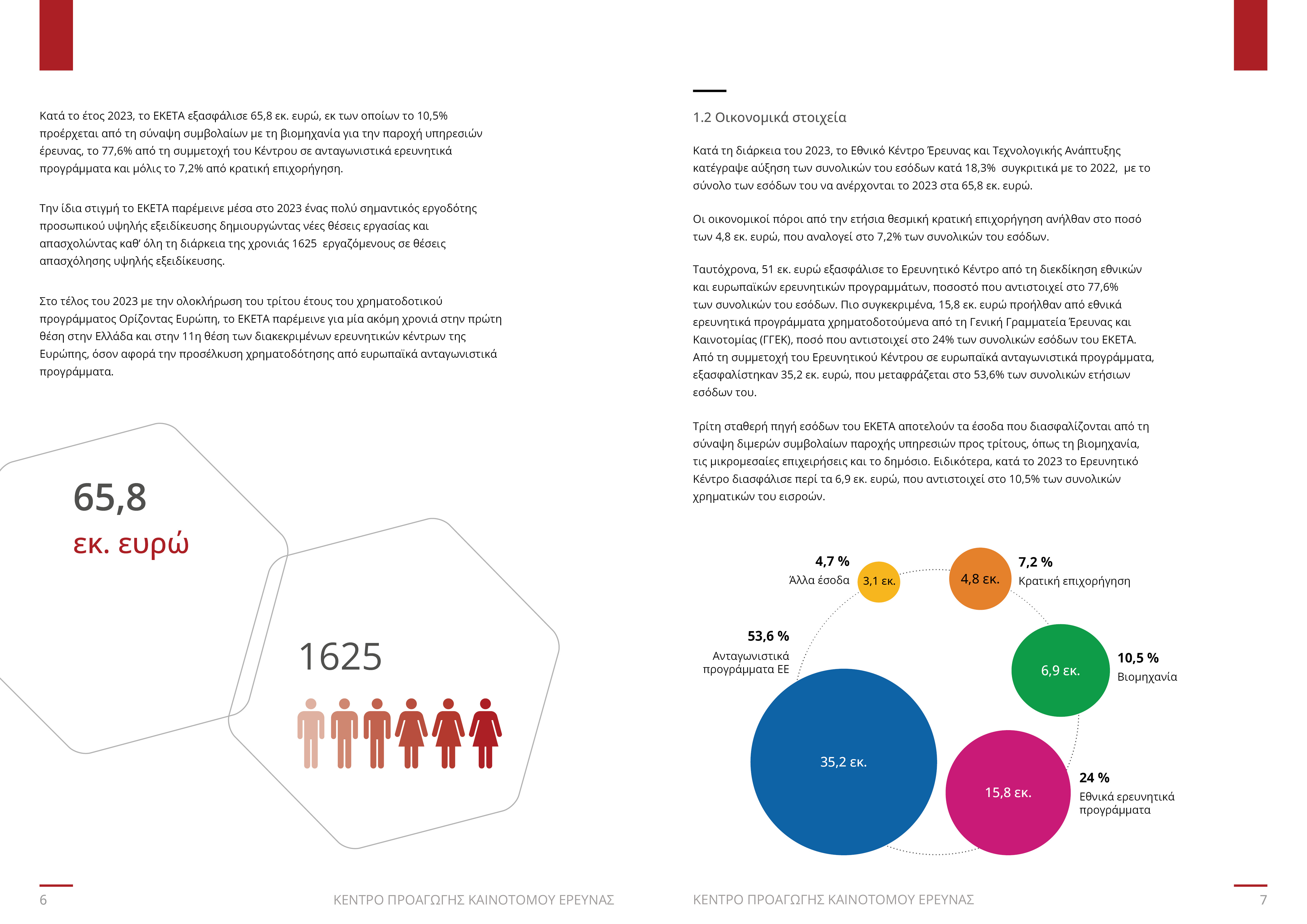 Η Έκθεση Πεπραγμένων 2023 του Εθνικού Κέντρου Έρευνας και Τεχνολογικής Ανάπτυξης παρουσιάζει συνοπτικά τις εξελίξεις και την πρόοδο του Ερευνητικού Κέντρου σε επίπεδο στοιχείων και αριθμών, αναπτυξιακών δράσεων, ανθρώπινου δυναμικού, καινοτόμων ερευνητικών αποτελεσμάτων, συνεργασιών με τη βιομηχανία και επιχειρηματικών πρωτοβουλιών. Παράλληλα, ιδιαίτερη αναφορά γίνεται στον αντίκτυπο του έργου του ΕΚΕΤΑ στους πολίτες και την κοινωνία.