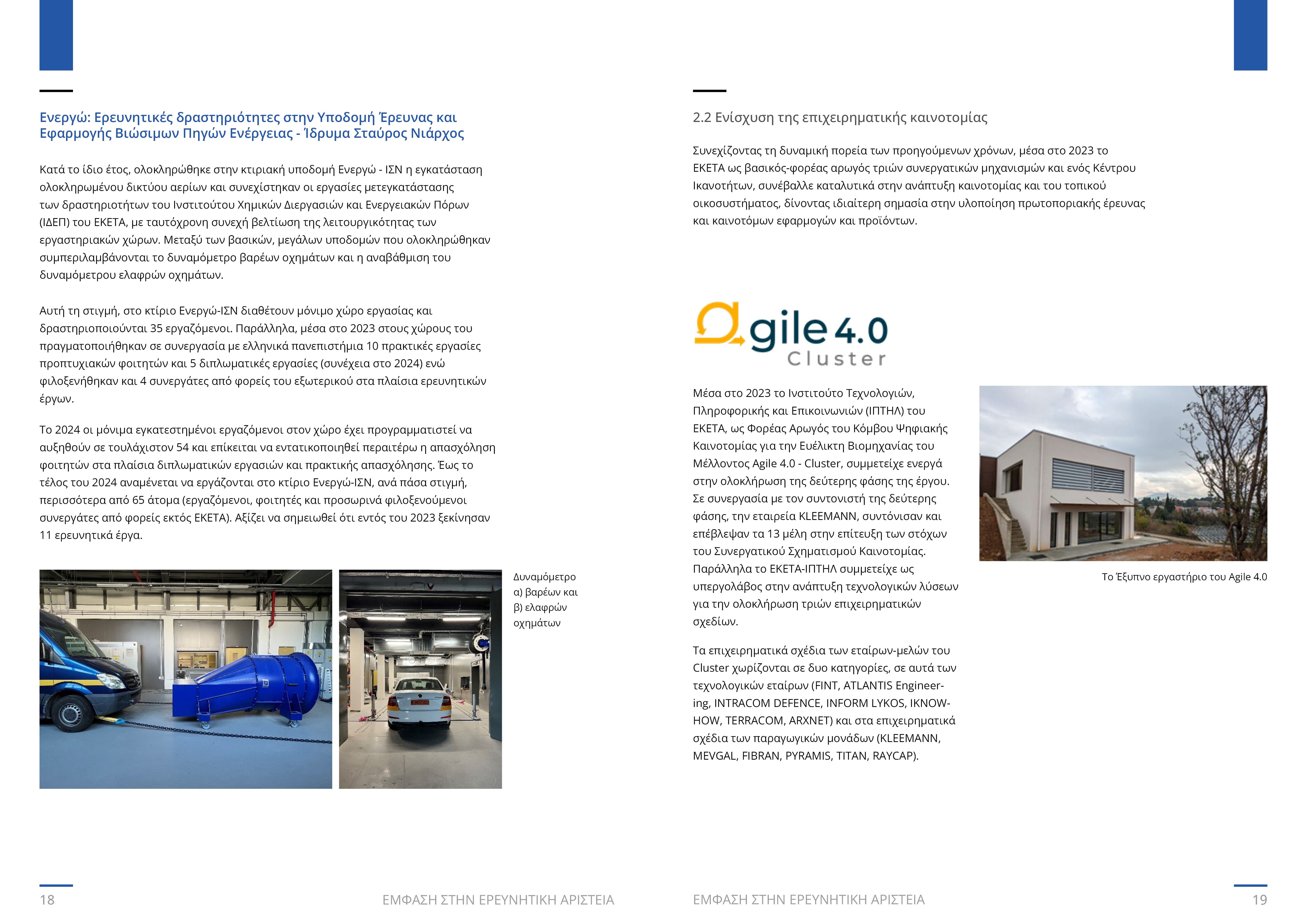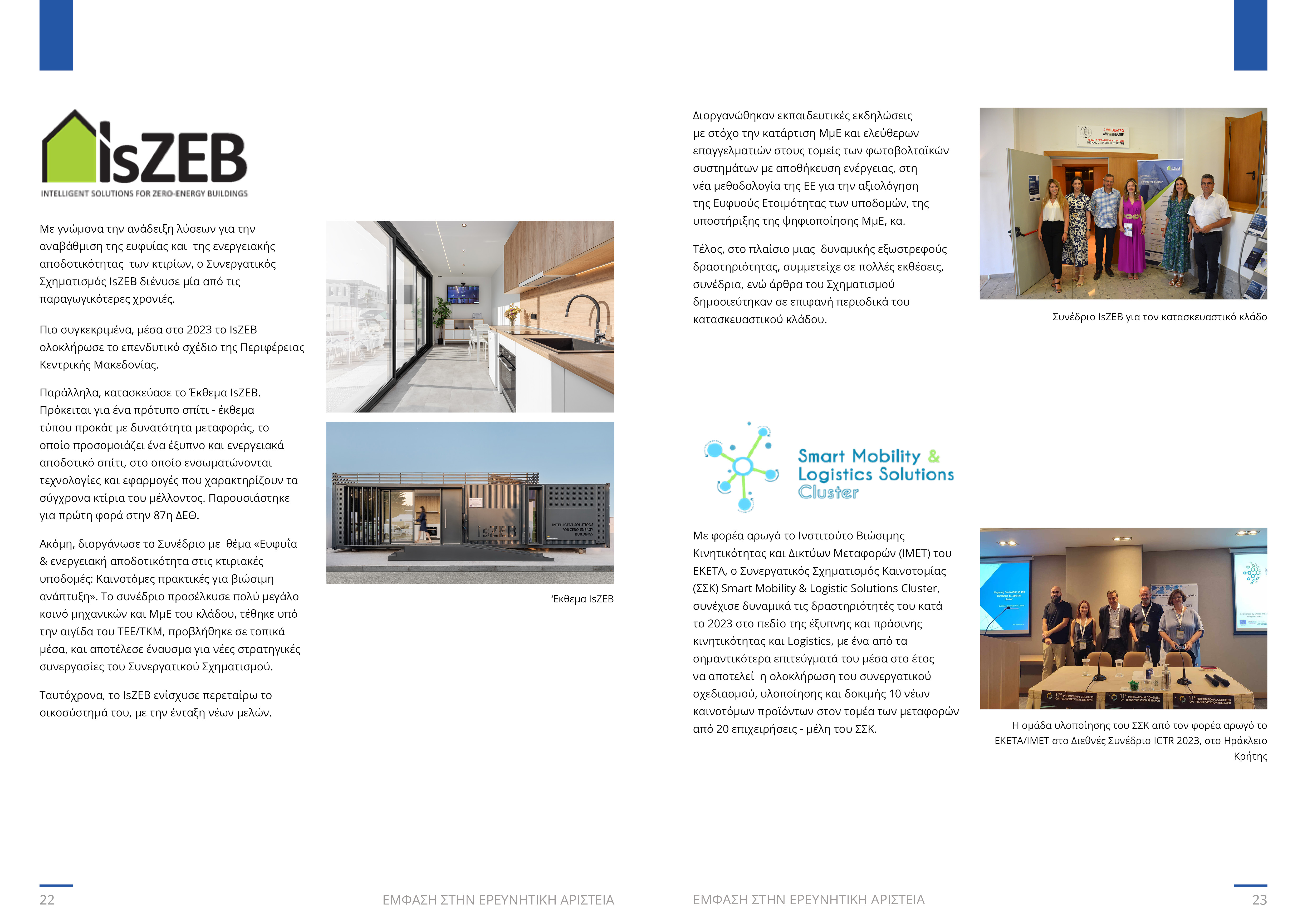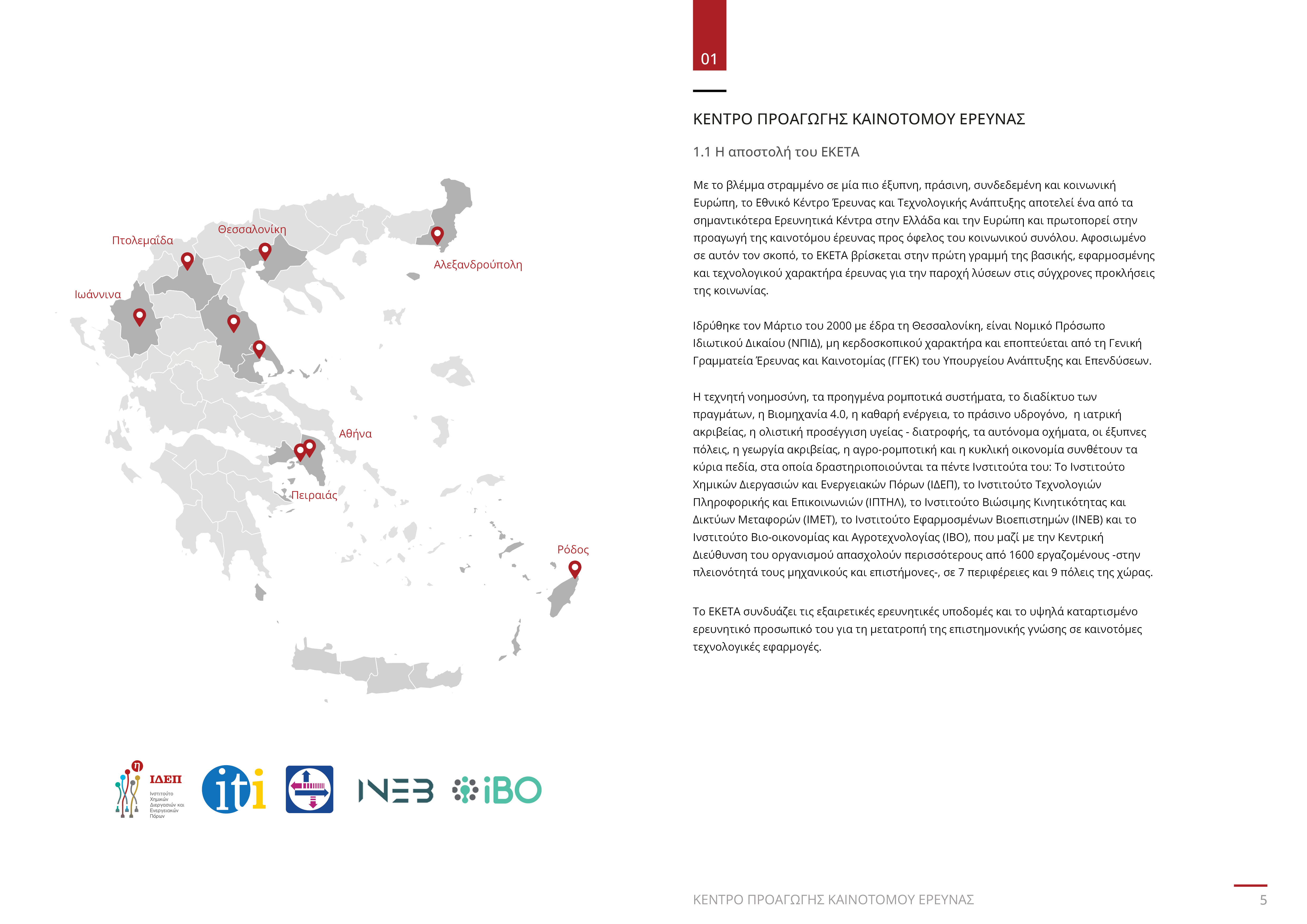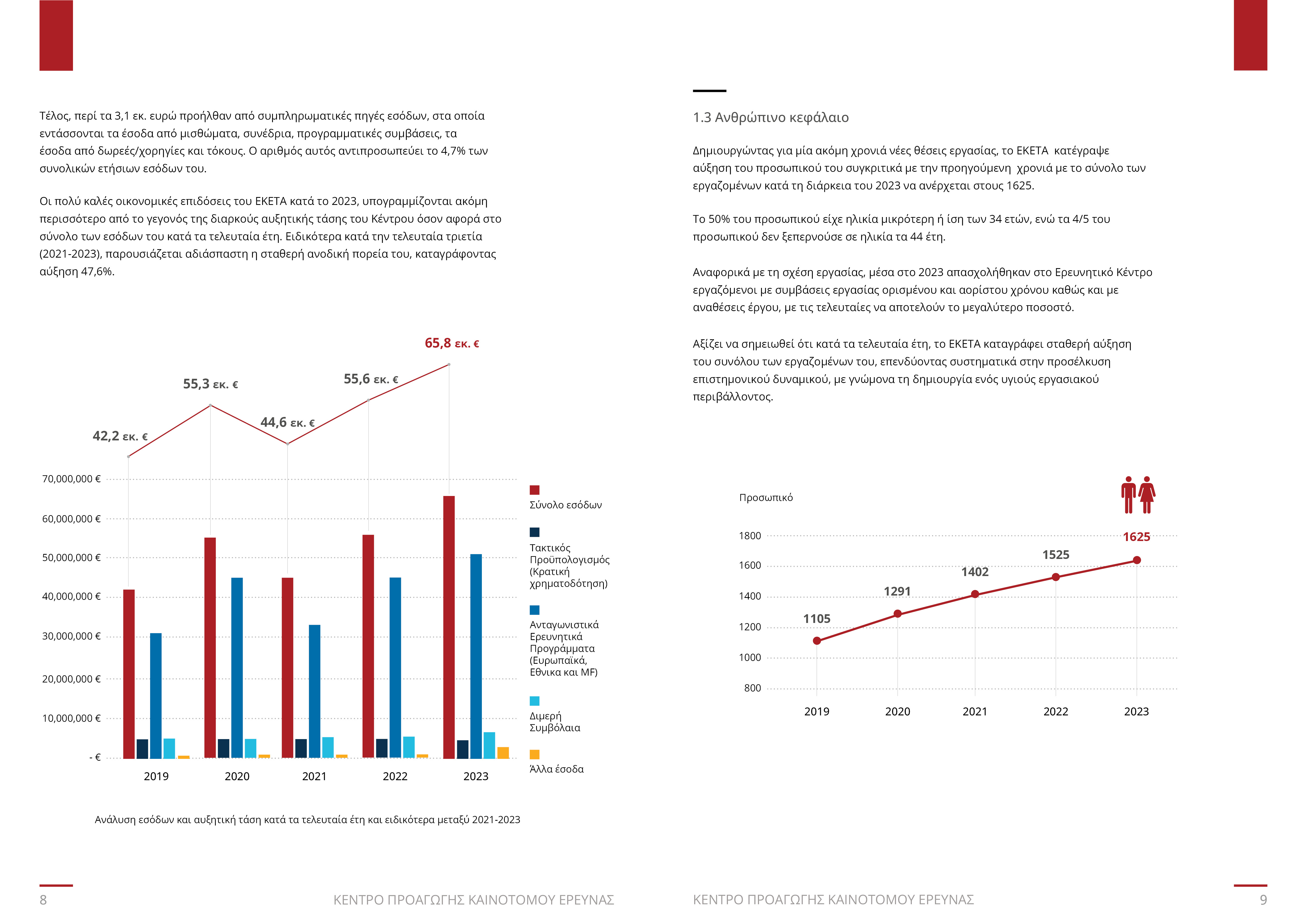 Η Έκθεση Πεπραγμένων 2023 του Εθνικού Κέντρου Έρευνας και Τεχνολογικής Ανάπτυξης παρουσιάζει συνοπτικά τις εξελίξεις και την πρόοδο του Ερευνητικού Κέντρου σε επίπεδο στοιχείων και αριθμών, αναπτυξιακών δράσεων, ανθρώπινου δυναμικού, καινοτόμων ερευνητικών αποτελεσμάτων, συνεργασιών με τη βιομηχανία και επιχειρηματικών πρωτοβουλιών. Παράλληλα, ιδιαίτερη αναφορά γίνεται στον αντίκτυπο του έργου του ΕΚΕΤΑ στους πολίτες και την κοινωνία.