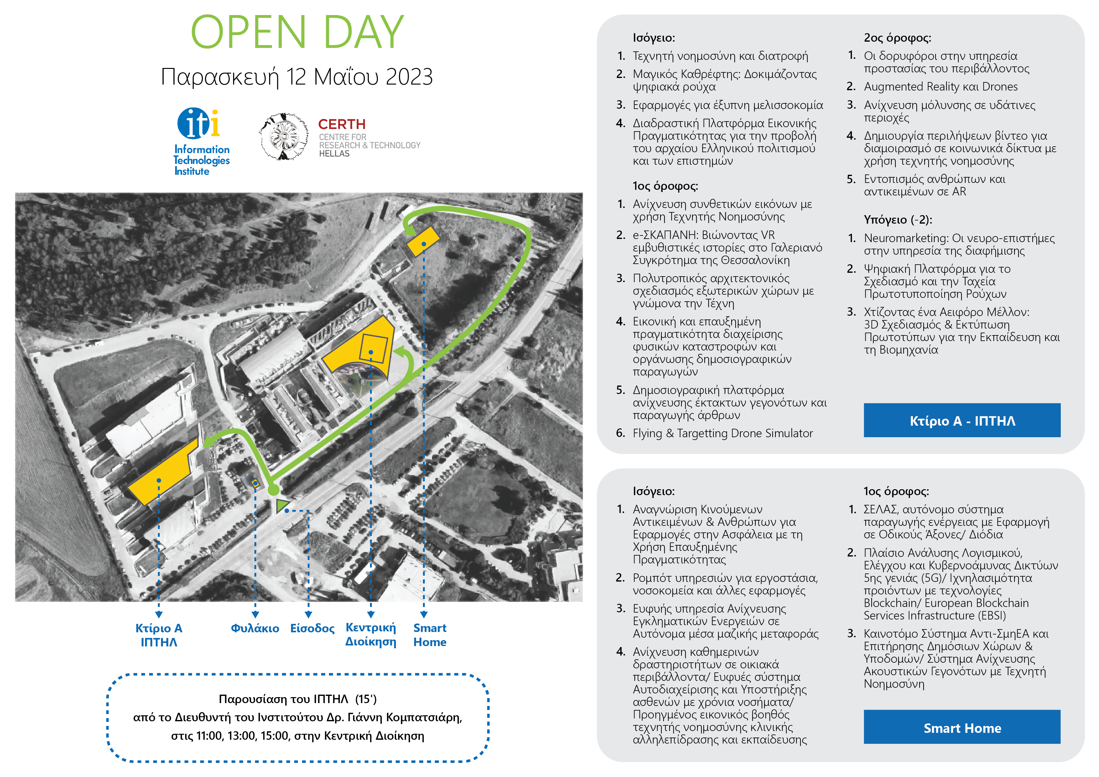 Το Ινστιτούτο Τεχνολογιών Πληροφορικής και Επικοινωνιών (ΙΠΤΗΛ), του Εθνικού Κέντρου Έρευνας και Τεχνολογικής Ανάπτυξης (ΕΚΕΤΑ), την Παρασκευή στις 12 Μαΐου 2023, ανοίγει τις πόρτες του και σας προσκαλεί σε μια ενδιαφέρουσα ξενάγηση στις ερευνητικές του δραστηριότητες.