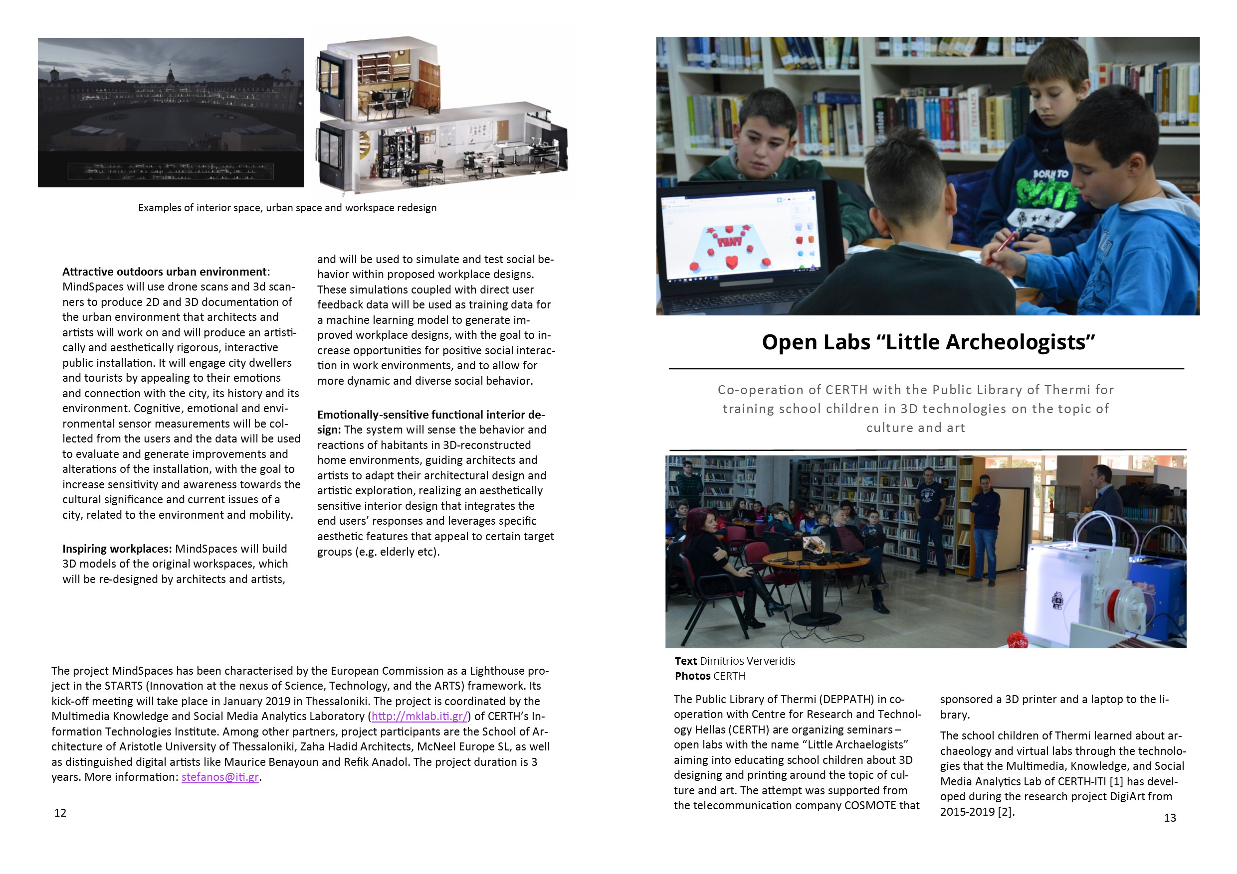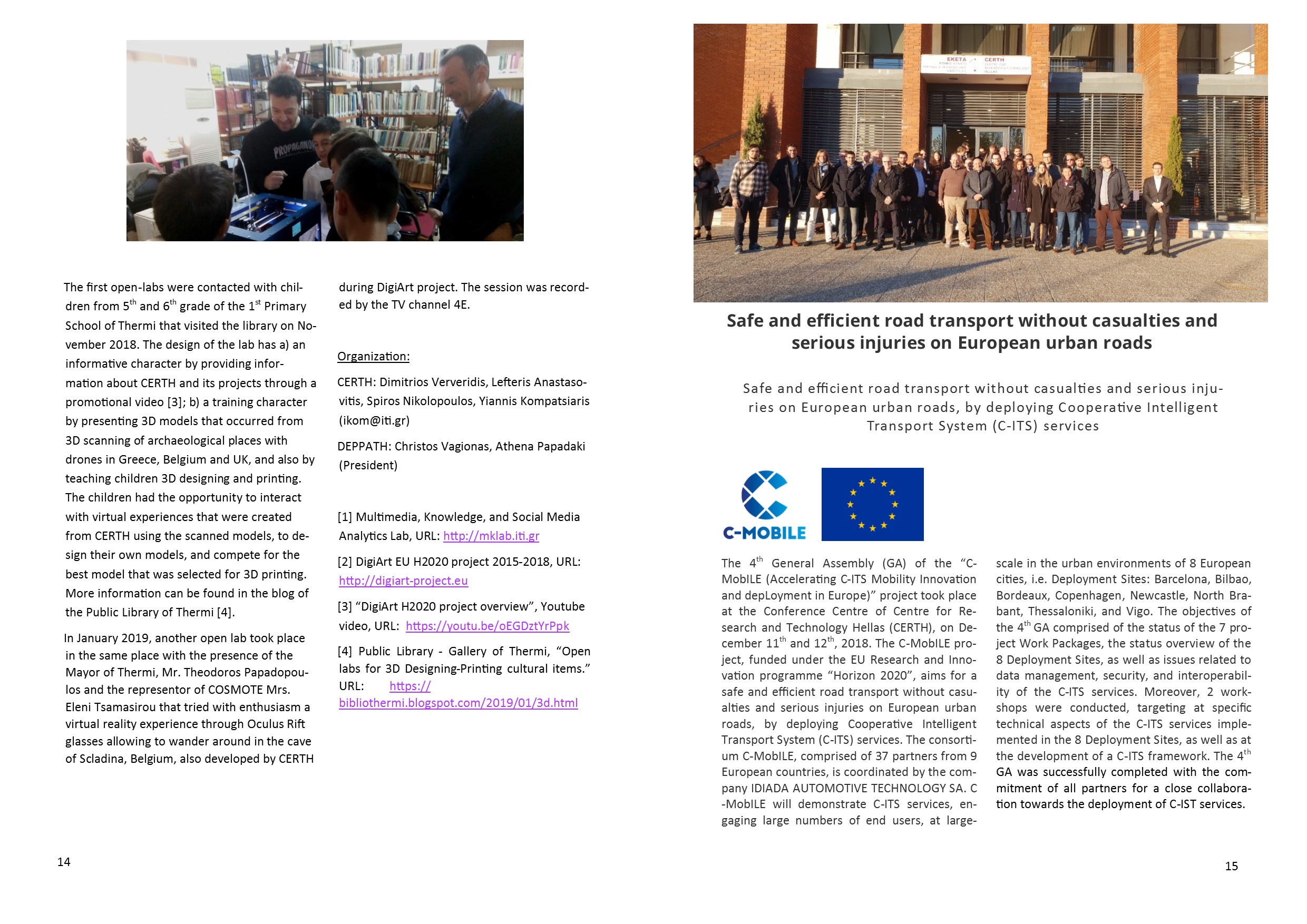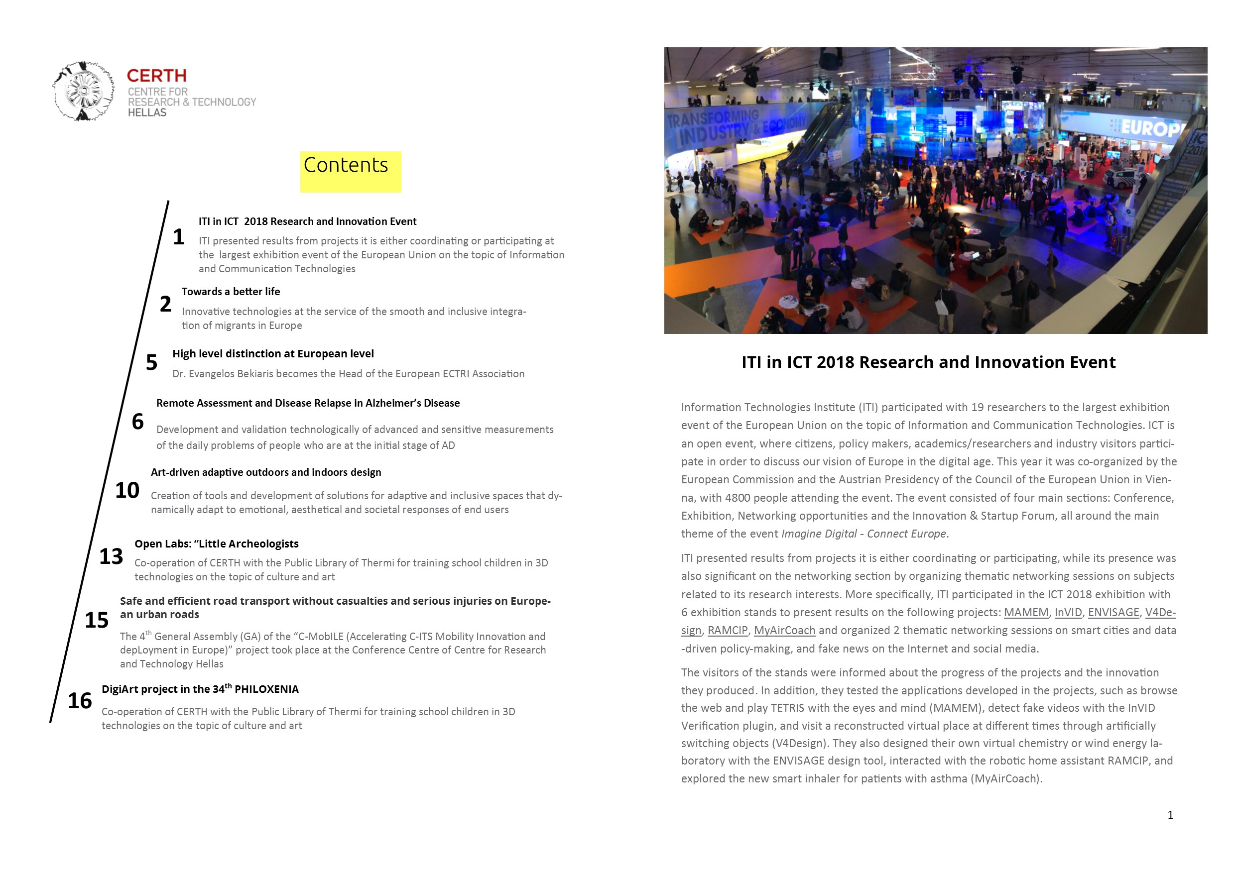 Content ITI in ICT 2018 Research and Innovation Event ITI presented results from projects it is either coordinating or participating at the largest exhibition event of the European Union on the topic of Information and Communication Technologies Towards a better life Innovative technologies at the service of the smooth and inclusive integration of migrants in Europe High level distinction at European level Dr. Evangelos Bekiaris becomes the Head of the European ECTRI Association Remote Assessment and Disease Relapse in Alzheimer’s Disease Development and validation technologically of advanced and sensitive measurements of the daily problems of people who are at the initial stage of AD Art-driven adaptive outdoors and indoors design Creation of tools and development of solutions for adaptive and inclusive spaces that dynamically adapt to emotional, aesthetical and societal responses of end users Open Labs: “Little Archeologists Co-operation of CERTH with the Public Library of Thermi for training school children in 3D technologies on the topic of culture and art Safe and efficient road transport without casualties and serious injuries on European urban roads The 4th General Assembly (GA) of the “C-MobILE (Accelerating C-ITS Mobility Innovation and deployment in Europe)” project took place at the Conference Centre of Centre for Research and Technology Hellas DigiArt project in the 34th PHILOXENIA Co-operation of CERTH with the Public Library of Thermi for training school children in 3D technologies on the topic of culture and art |