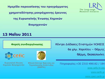 >> Είναι η πρώτη φορά που δίνεται η δυνατότητα παρουσίασης του προγράμματος χρηματοδότησης μακρόχρονης έρευνας της Ευρωπαϊκής Ένωσης Χημικών Βιομηχανιών (CEFIC) στην Ελλάδα.![]()