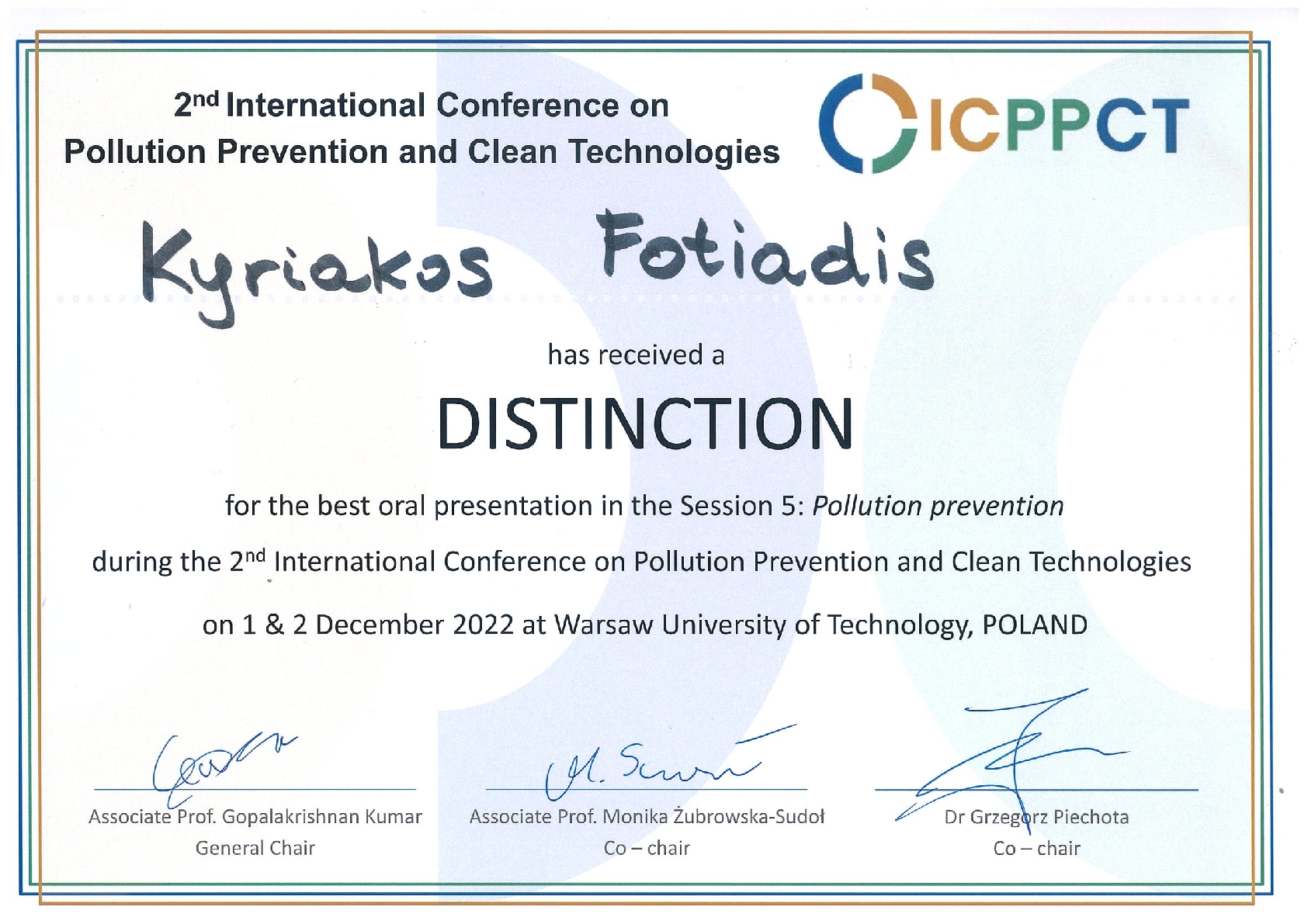 Το βραβείο της καλύτερης επιστημονικής παρουσίασης στην θεματική ενότητα “Pollution prevention” του 2ου διεθνούς συνεδρίου International Conference on Pollution Prevention and Clean Technologies (#ICPPCT), που πραγματοποιήθηκε στην Βαρσοβία της Πολωνίας (1-2 Δεκεμβρίου 2022), έλαβε η ομάδα του εργαστηρίου ARTEMIS του Ινστιτούτου Χημικών Διεργασιών και Ενεργειακών Πόρων (ΙΔΕΠ) του ΕΚΕΤΑ.
