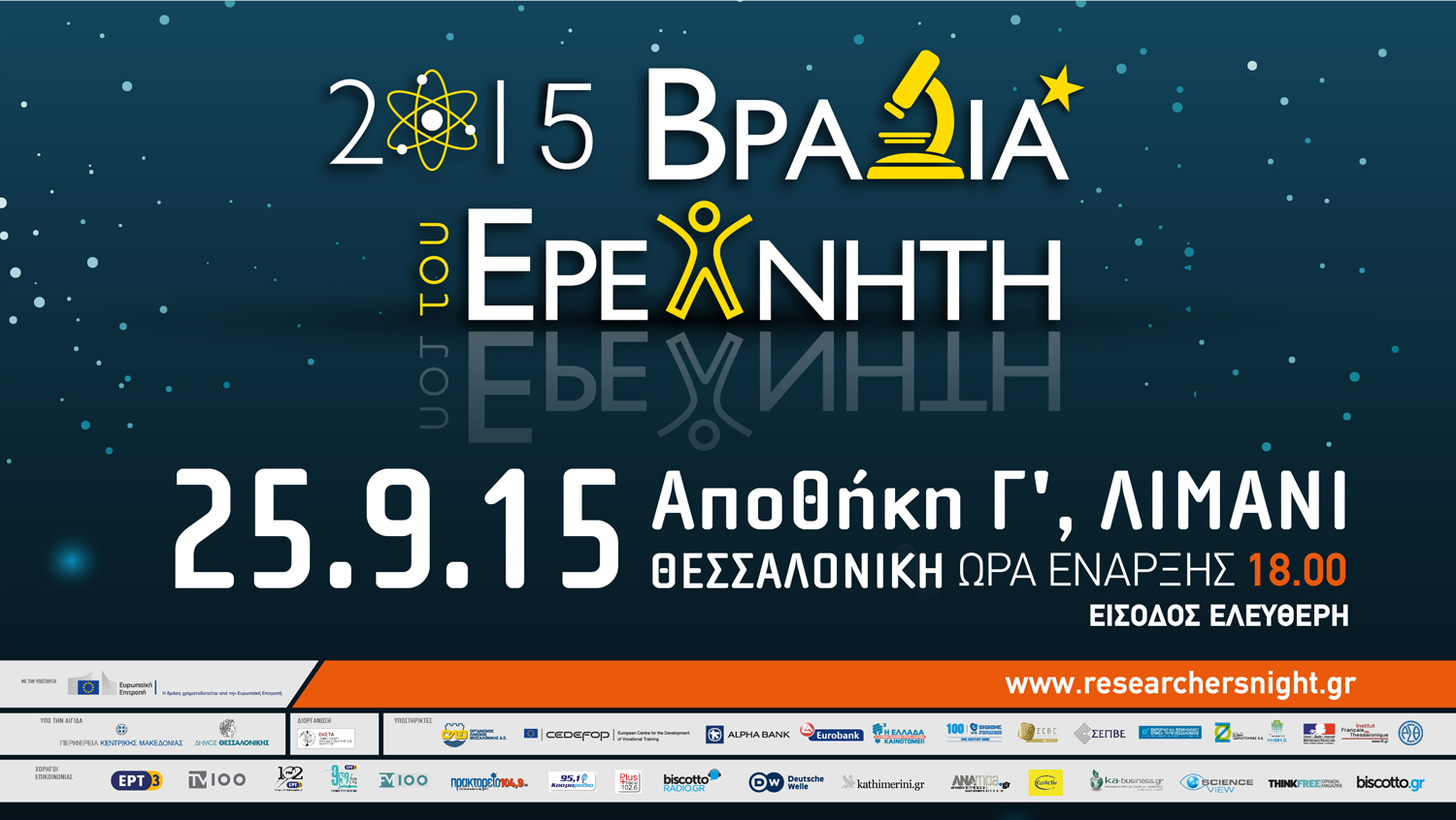Η «Βραδιά του Ερευνητή» διοργανώνεται από το Εθνικό Κέντρο Έρευνας και Τεχνολογικής Ανάπτυξης (EKETA) στην Αποθήκη Γ΄ στο Λιμάνι με ώρα έναρξης στις 18:00 και Ελεύθερη Είσοδο
