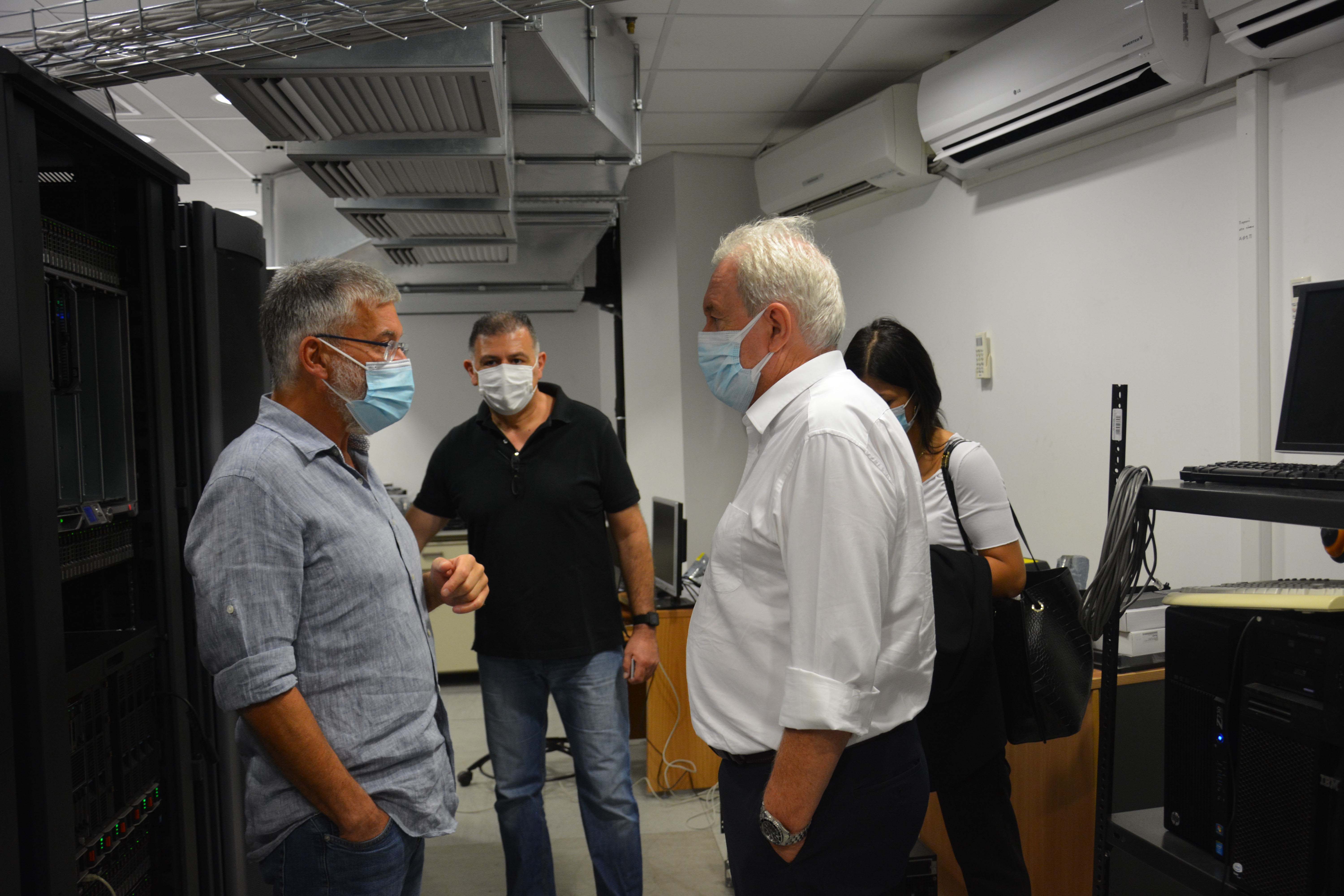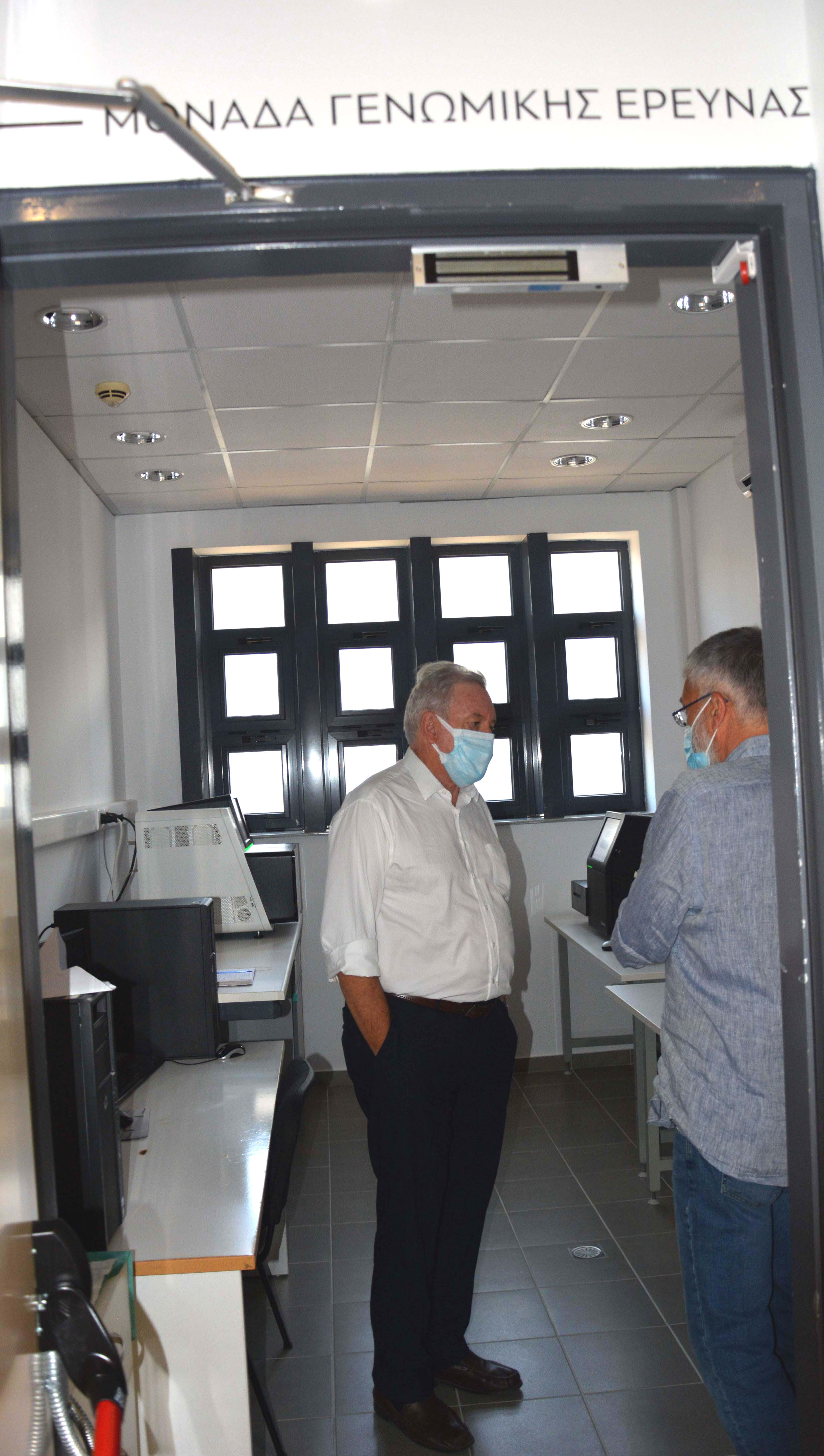 Στο Ινστιτούτο Εφαρμοσμένων Βιοεπιστημών (ΙΝΕΒ), ο κ. Κυριαζής ξεναγήθηκε στην Υπολογιστική Δομή, τη Μονάδα Μοριακής Διάγνωσης καθώς και τη Μονάδα Γενωμικής Έρευνας και ενημερώθηκε σχετικά με τις διαπιστεύσεις που διαθέτει το Ινστιτούτο ως προς την παραγωγή, διαχείριση και ανάλυση βιοδεδομένων μεγάλου όγκου, τις εργαστηριακές εξετάσεις και την επιχειρησιακή συνέχεια.