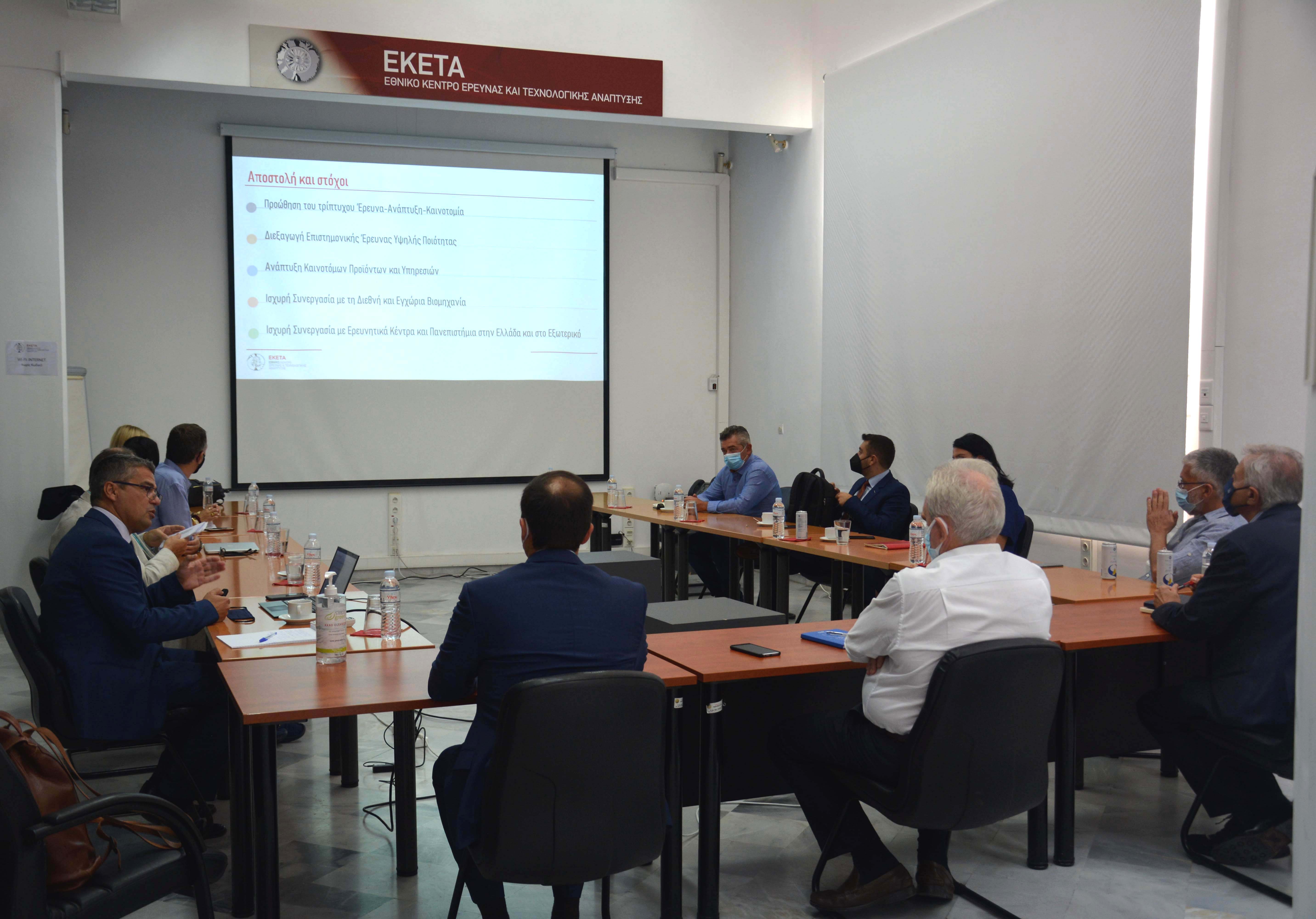 Το Εθνικό Κέντρο Έρευνας και Τεχνολογικής Ανάπτυξης επισκέφθηκε τη Δευτέρα 13 Σεπτεμβρίου 2021, ο Γενικός Γραμματέας Έρευνας και Καινοτομίας, Καθηγητής Αθανάσιος Κυριαζής. Εκεί τον υποδέχτηκε ο Πρόεδρος του ΕΚΕΤΑ, Δρ. Δημήτριος Τζοβάρας και στη συνέχεια ακολούθησε συνάντηση με το Διοικητικό Συμβούλιο του ΕΚΕΤΑ. Κατά τη διάρκεια συνάντησης, ο κ. Κυριαζής ενημερώθηκε για την ερευνητική και επιχειρηματική δραστηριότητα του Κέντρου ενώ ακολούθησε συζήτηση με τα μέλη του Διοικητικού Συμβουλίου. Στη συνέχεια, ο κ. Κυριαζής ξεναγήθηκε παρουσία των Διευθυντών και του Προέδρου του ΕΚΕΤΑ στα Ινστιτούτα και ενημερώθηκε από κοντά για τα τεχνολογικά τους επιτεύγματα.