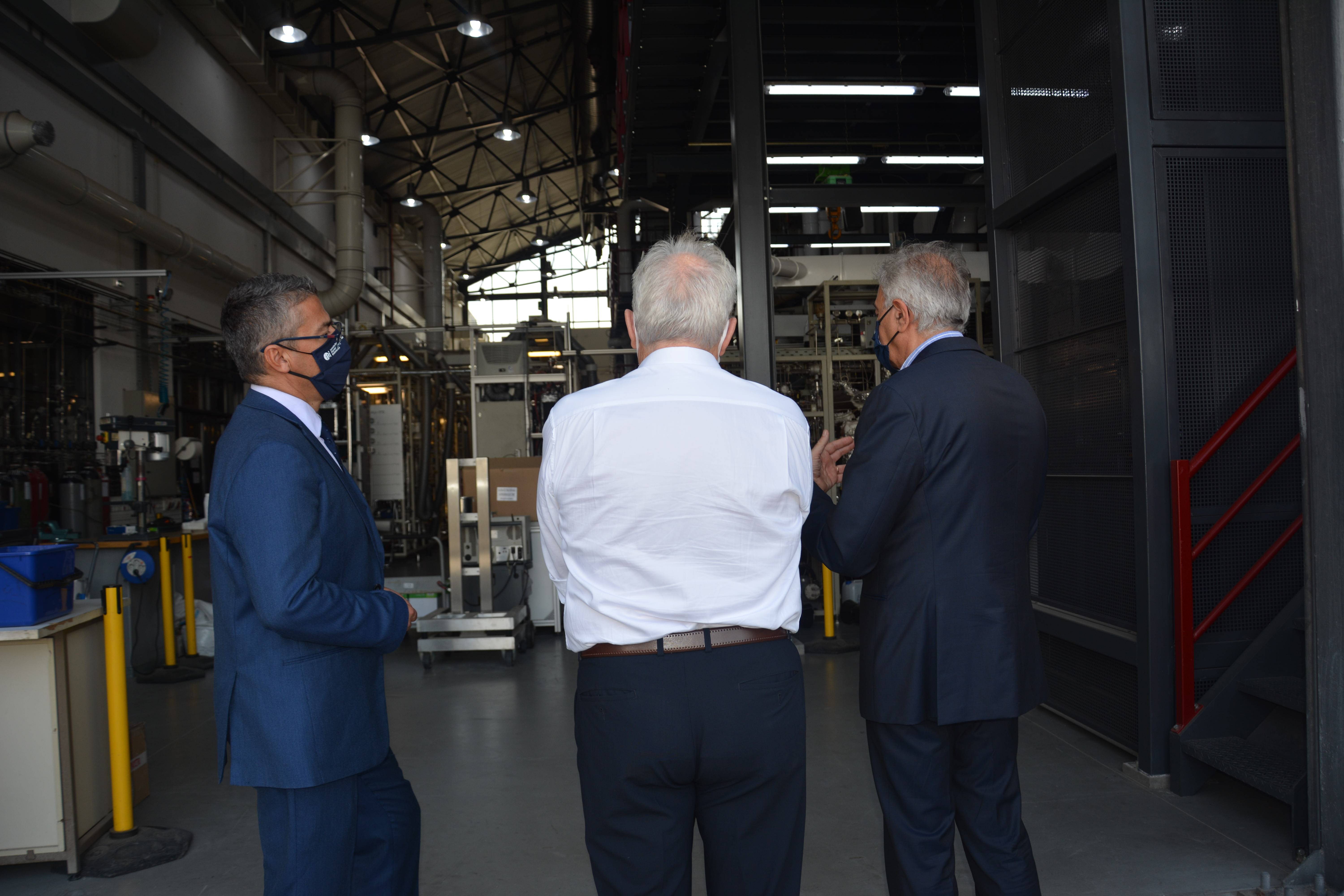Τέλος, ο κ. Κυριαζής επισκέφθηκε το Εργαστήριο Μεγάλου Ύψους του Ινστιτούτου Χημικών Διεργασιών και Ενεργειακών Πόρων (ΙΔΕΠ) όπου και ενημερώθηκε για τις σύγχρονες προκλήσεις στον τομέα της καθαρής ενέργειας με τεχνολογίες υδρογόνου, δέσμευσης διοξειδίου του άνθρακα και τα υλικά που συμβάλλουν σε αυτές τις τεχνολογίες.