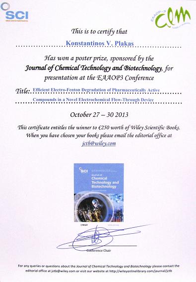 απονεμήθηκε στον Δρ. Κωνσταντίνο Πλάκα, μεταδιδακτορικό ερευνητή του Εργαστηρίου Φυσικών Πόρων και Εναλλακτικών Μορφών Ενέργειας (ΕΦΕΜ), Ινστιτούτο Χημικών Διεργασιών και Ενεργειακών Πόρων (ΙΔΕΠ), κατά τη διάρκεια του 3ου Πανευρωπαϊκού Συνεδρίου «Environmental Applications of Advanced Oxidation Processes» (EAAOP3) που πραγματοποιήθηκε μεταξύ 27-30 Οκτωβρίου 2013 στην Αλμερία, Ισπανία.