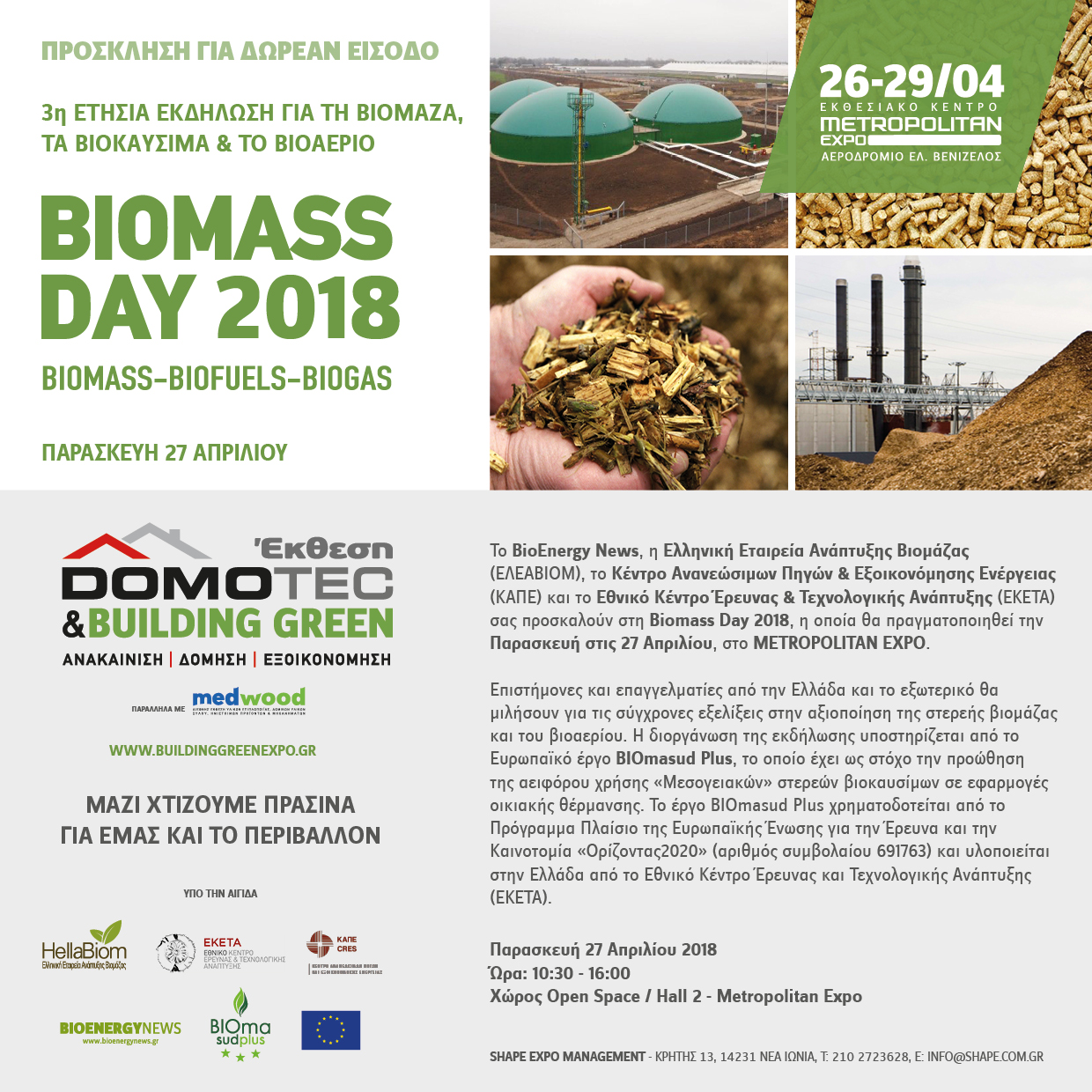 Την Παρασκευή 27 Απριλίου 2018, ώρες 10:30 - 16:00 στο METROPOLITAN EXPO (Αεροδρόμιο Ελευθέριος Βενιζέλος), θα πραγματοποιηθεί η εκδήλωση "Biomass Day 2018" ως παράλληλη δραστηριότητα Expo. Η διοργάνωση της εκδήλωσης υποστηρίζεται από το Ευρωπαϊκό έργο BIOmasud Plus (http://biomasudplus.eu/), το οποίο έχει ως στόχο την προώθηση της αειφόρου χρήσης «Μεσογειακών» στερεών βιοκαυσίμων σε εφαρμογές οικιακής θέρμανσης. Το έργο BIOmasud Plus χρηματοδοτείται από το Πρόγραμμα Πλαίσιο της Ευρωπαϊκής Ένωσης για την Έρευνα και την Καινοτομία «Ορίζοντας2020» (αριθμός συμβολαίου 691763) και υλοποιείται στην Ελλάδα από το ΕΚΕΤΑ.