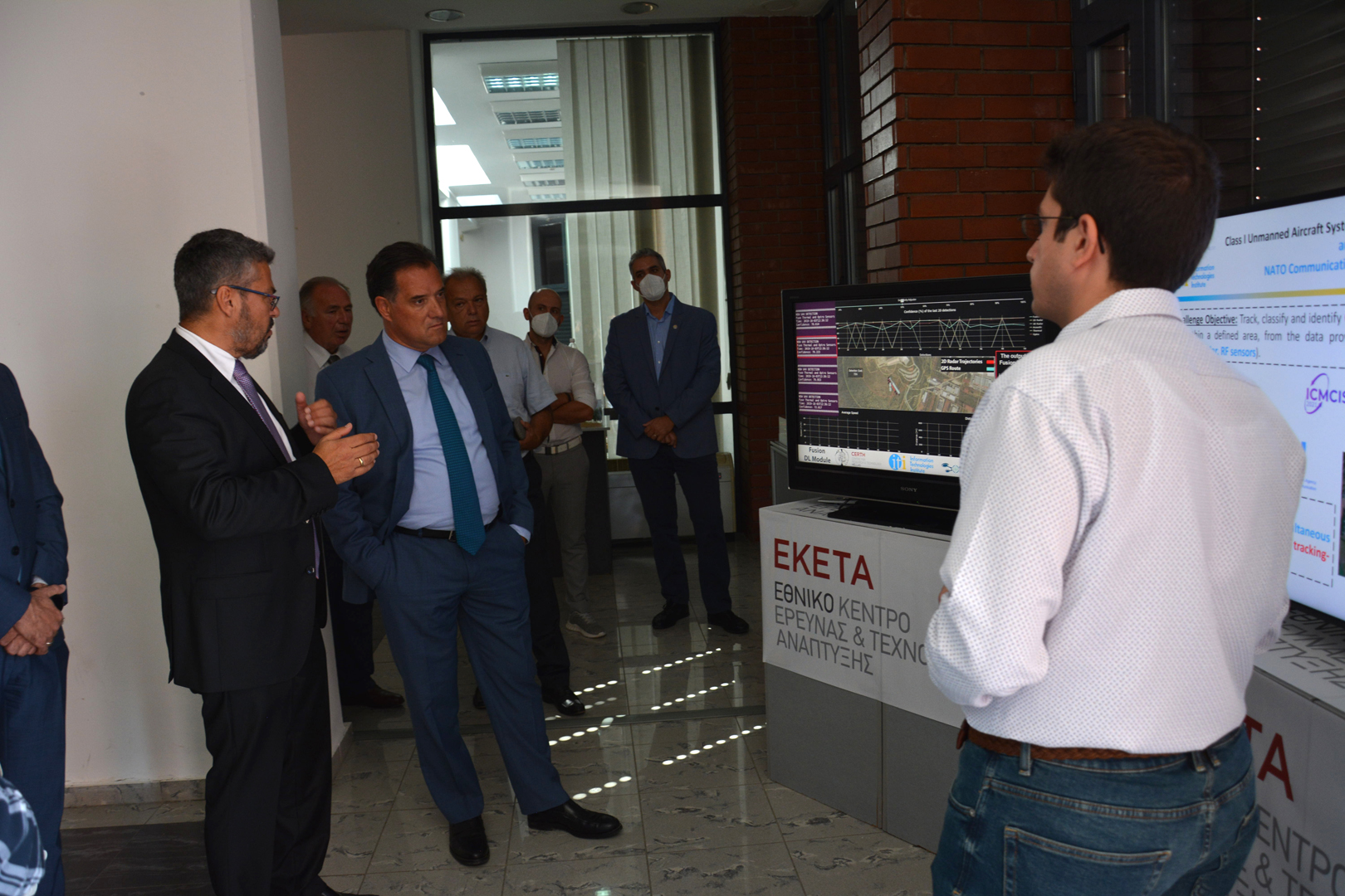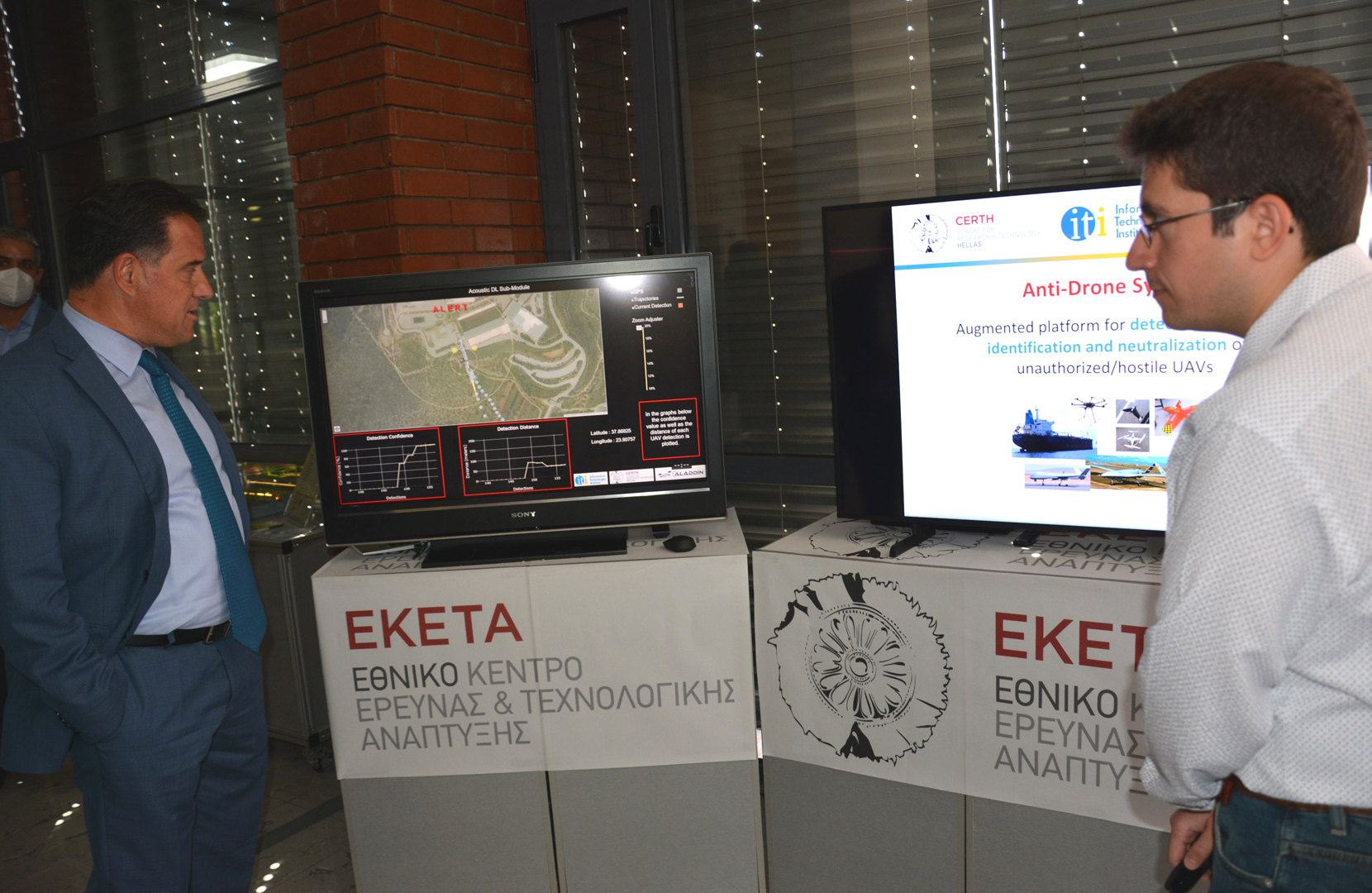 Ιδιαίτερο ήταν το ενδιαφέρον που έδειξε ο κ. Γεωργιάδης για το βραβευμένο σε διαγωνισμό του NATO anti-drone σύστημα, που έχει αναπτυχθεί από το Εργαστήριο Οπτικής Αναλυτικής του EKETA | ΙΠΤΗΛ και παρέχει μία ολοκληρωμένη λύση στο αυξημένο πρόβλημα της απειλής ΣμηΕΑ (Συστήματα μη Επανδρωμένων Αεροσκαφών).