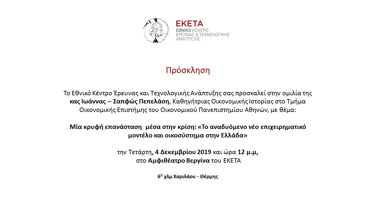 Το Εθνικό Κέντρο Έρευνας και Τεχνολογικής Ανάπτυξης σας προσκαλεί στην ομιλία της κας Ιωάννας – Σαπφώς Πεπελάση, με θέμα: Μία κρυφή επανάσταση μέσα στην κρίση: «Το αναδυόμενο νέο επιχειρηματικό μοντέλο και οικοσύστημα στην Ελλάδα», την Τετάρτη, 4 Δεκεμβρίου 2019 και ώρα 12 μ.μ, στο Αμφιθέατρο Βεργίνα του ΕΚΕΤΑ.