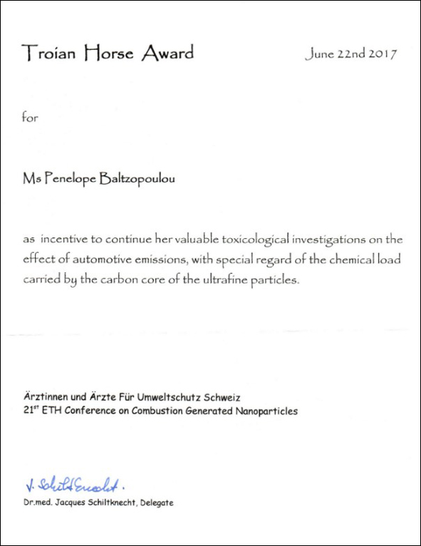 Aerosol and Particle Technology Laboratory’s (APTL) scientific work on the health effects assessment of the diesel emissions was awarded by the Swiss doctors for the Environmental Protection ("Ärztinnen und Ärzte für Umweltschutz") with the Trojan Horse Prize for the best contribution on investigation health effects of automotive emissions, during the 21st ETH-Conference on Combustion Generated Nanoparticles at Zurich on June 19-22, 2017.