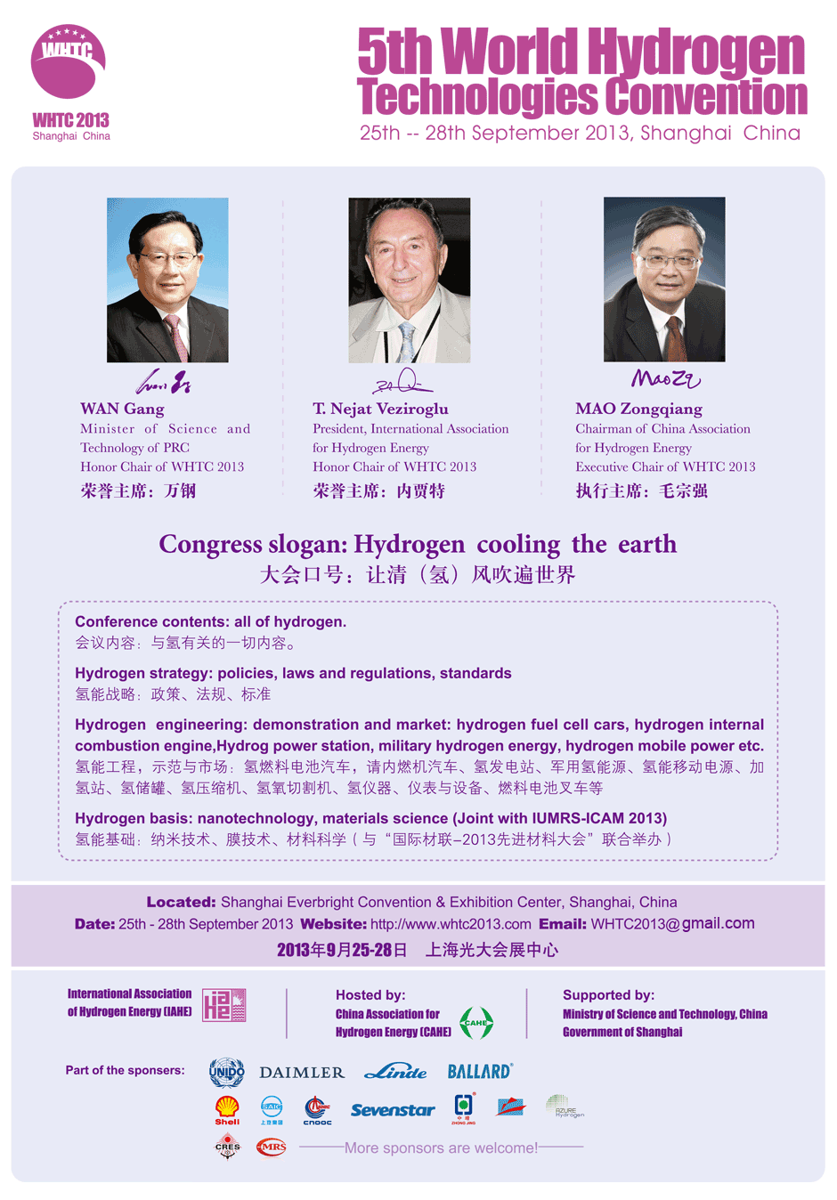 >> The major goals of WHTC are to connect hydrogen theories with applications as well as to encourage interactions among scholars and practitioners from academia and industries. WHTC includes hydrogen energy conference and hydrogen technologies & equipments exhibition.