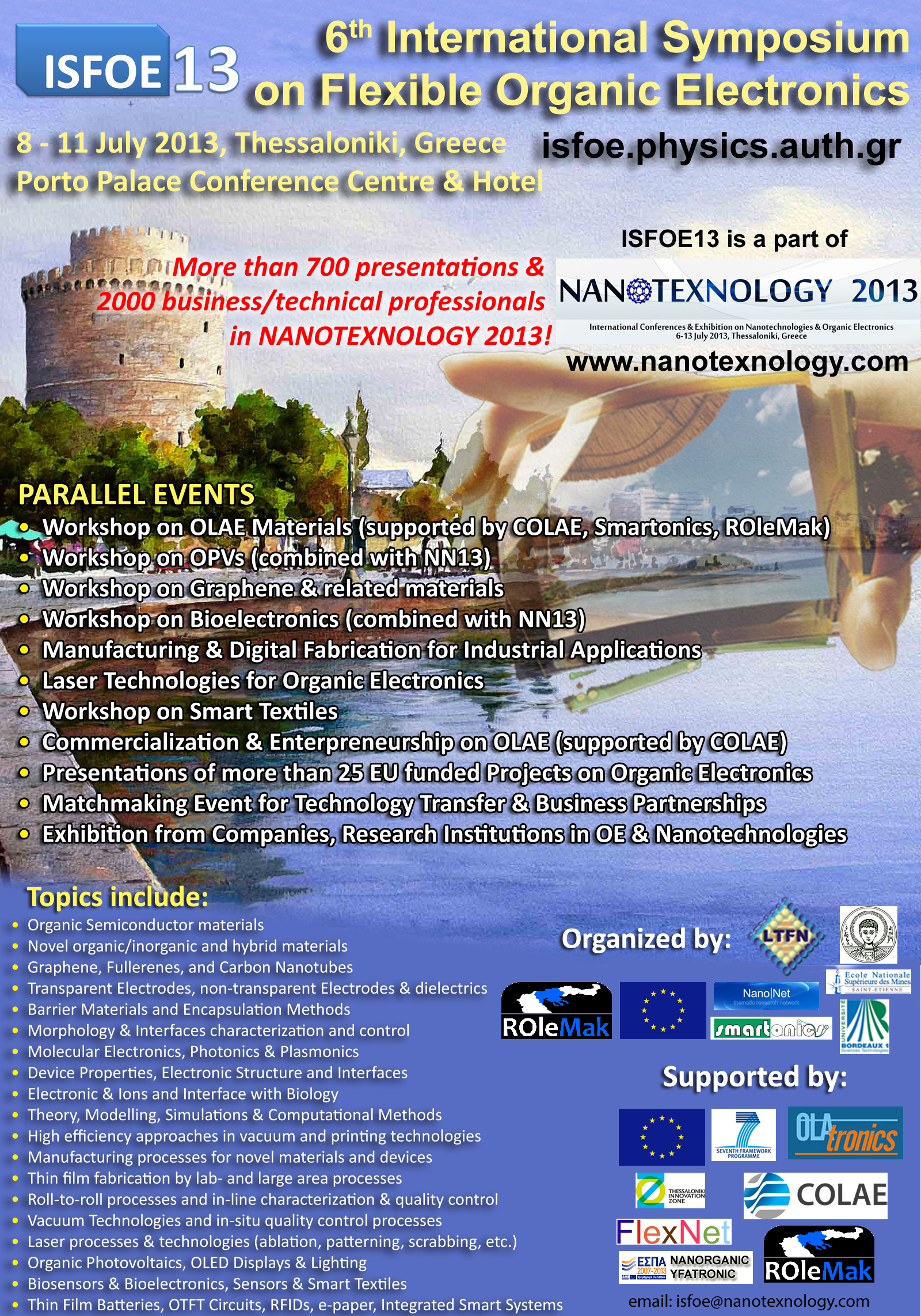 >> ISFOE13 is the biggest scientific & technology event in Flexible Organic Electronics (OEs), that promotes the Scientific Research in OE nanomaterials, Manufacturing Processes, Devices and Applications. During ISFOE13 you will meet with other world-class scientists, engineers and representatives from industries to discuss & exchange ideas on the hottest topics on OEs.