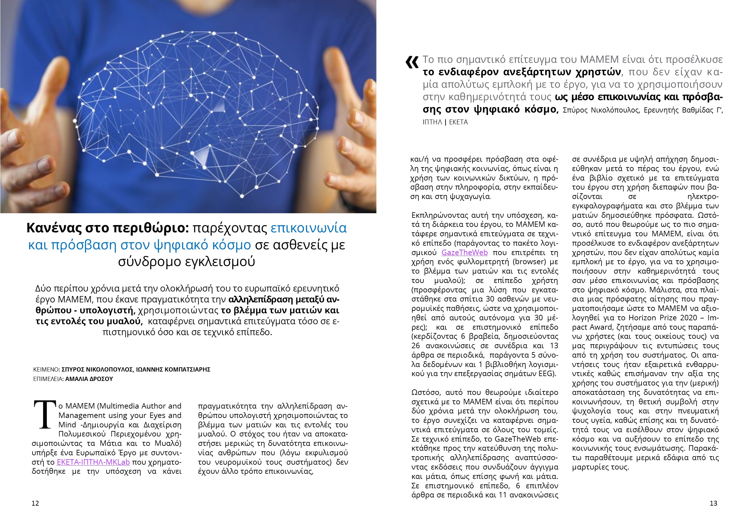 Το ευρωπαϊκό ερευνητικό έργο ΜΑΜΕΜ, που έκανε πραγματικότητα την αλληλεπίδραση μεταξύ ανθρώπου-υπολογιστή, καταφέρνει σημαντικά επιτεύγματα τόσο σε τεχνικό όσο και σε επιστημονικό επίπεδο