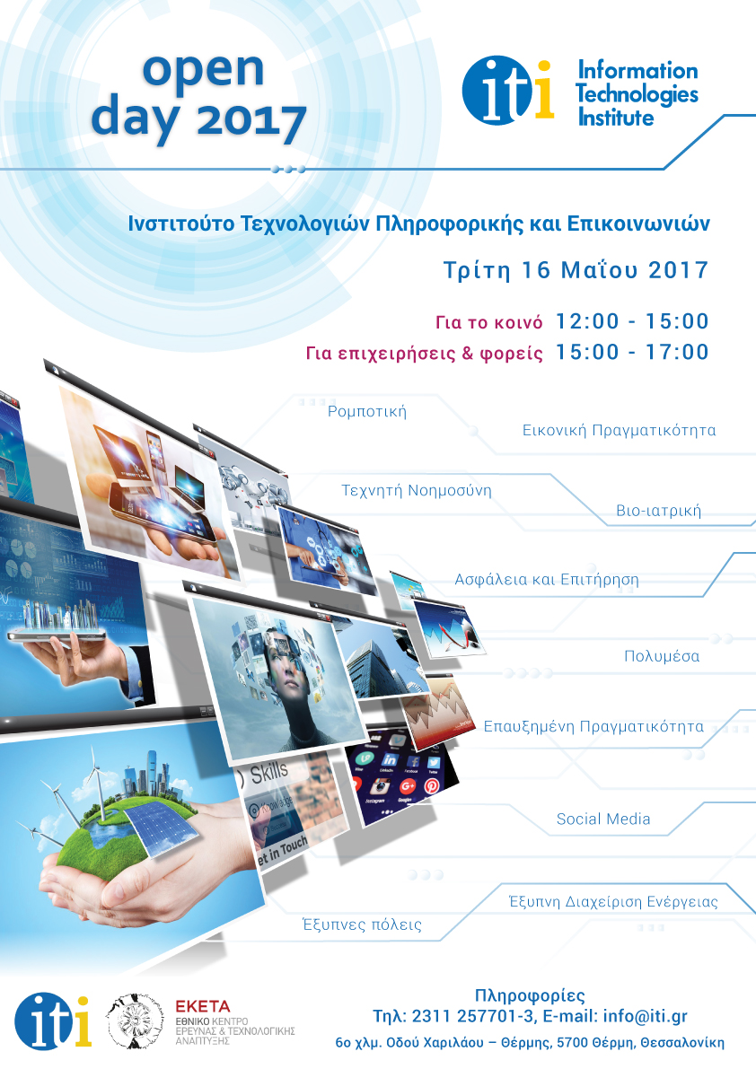 To Ινστιτούτο Τεχνολογιών Πληροφορικής και Επικοινωνιών (ΙΠΤΗΛ) του Εθνικού Κέντρου Έρευνας και Τεχνολογικής Ανάπτυξης (ΕΚΕΤΑ) σας προσκαλεί στην εκδήλωση ανοιχτής μέρας για το κοινό και τις επιχειρήσεις, που διοργανώνει την Τρίτη, 16 Μαΐου 2017. Από τις 12:00 μμ. μέχρι τις 15.00 μμ. επισκέπτες όλων των ηλικιών, θα έχουν τη δυνατότητα να γνωρίσουν από κοντά το συναρπαστικό κόσμο της Πληροφορικής και να ενημερωθούν για τα ερευνητικά αποτελέσματα της δουλειάς του ΕΚΕΤΑ / ΙΠΤΗΛ επάνω σε ένα ευρύ φάσμα πεδίων όπως η Ρομποτική, η Τεχνητή Νοημοσύνη, η Επαυξημένη Πραγματικότητα κ.α.