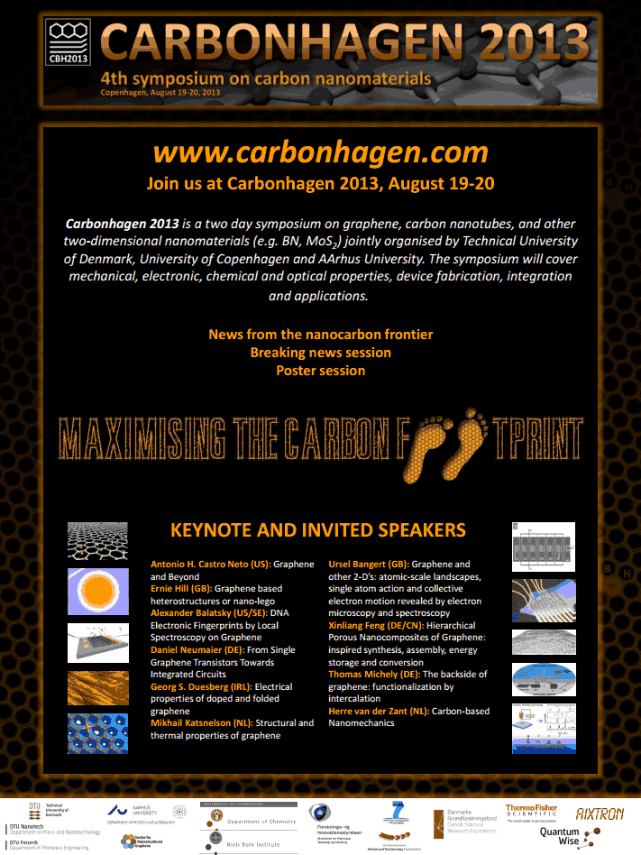 >> Carbonhagen 2013 is a two day symposium on graphene, carbon nanotubes, and other two-dimensional nanomaterials (e.g. BN, MoS2) jointly organised by Technical University of Denmark, University of Copenhagen and Århus University.