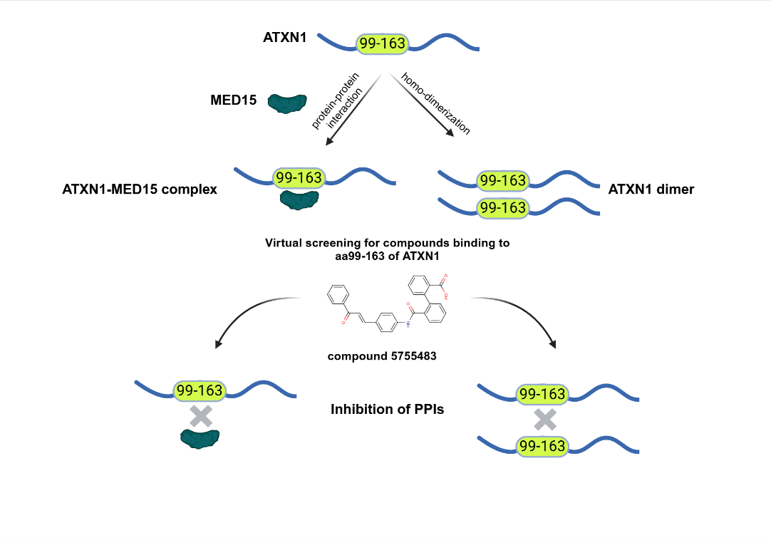Γραφική σύνοψη της μελέτης. Μέσω εικονικής σάρωσης και πειραματικής επιβεβαίωσης εντοπίστηκε ένα χημικό μόριο (5755483) που προσδένεται εκλεκτικά στην περιοχή 99-163 της πρωτεΐνης ATXN1 και παρεμποδίζει παθολογικές πρωτεϊνικές αλληλεπιδράσεις.