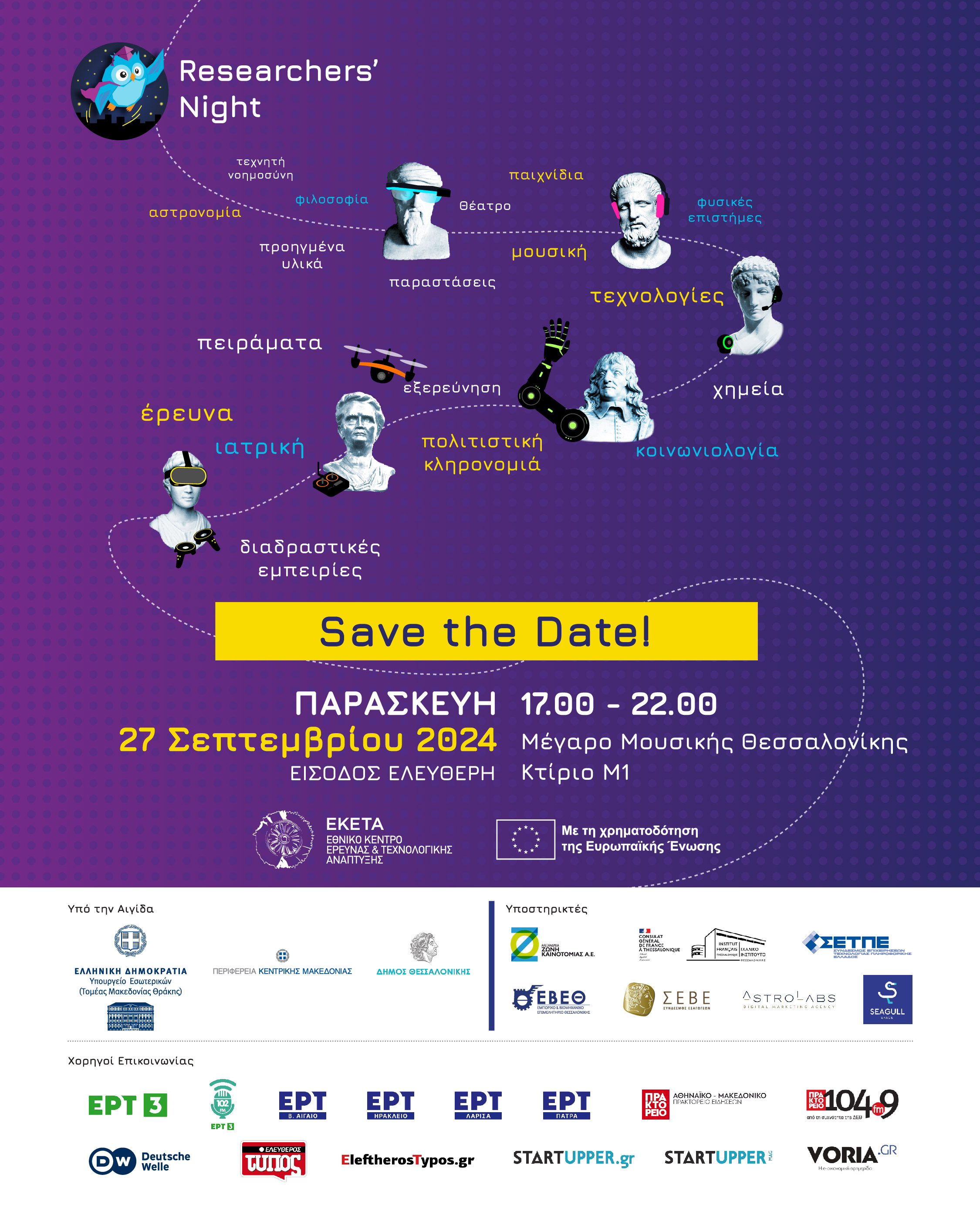 Ακολουθώντας την παράδοση των τελευταίων 16 ετών, το Εθνικό Κέντρο Έρευνας και Τεχνολογικής Ανάπτυξης διοργανώνει και συντονίζει τη Βραδιά του Ερευνητή στη Θεσσαλονίκη, την Παρασκευή, 27 Σεπτεμβρίου 2024 στο Μέγαρο Μουσικής (κτίριο Μ1).