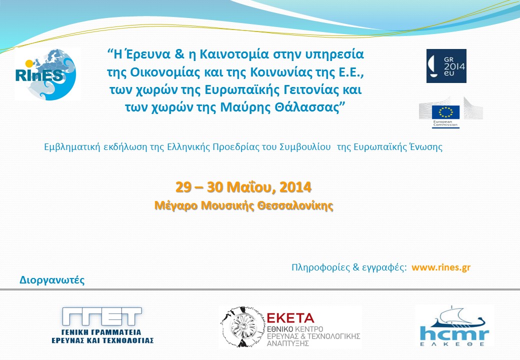 Η Γενική Γραμματεία Έρευνας και Τεχνολογίας (ΓΓΕΤ), το Εθνικό Κέντρο Έρευνας και Τεχνολογικής Ανάπτυξης (ΕΚΕΤΑ) και το Ελληνικό Κέντρο Θαλασσίων Ερευνών (ΕΛΚΕΘΕ) διοργανώνουν με τη συνεργασία και την υποστήριξη της Ευρωπαϊκής Επιτροπής (Γενική Διεύθυνση Έρευνας και Καινοτομίας) διήμερη εκδήλωση στο πλαίσιο της Ελληνικής Προεδρίας του Συμβουλίου της Ευρωπαϊκής Ένωσης με θέμα: «Η Έρευνα και η Καινοτομία στην υπηρεσία της Οικονομίας και της Κοινωνίας της Ε.Ε., των χωρών της Ευρωπαϊκής Επιτροπής και των χωρών της Μαύρης Θάλασσας (RInES)» στις 29 και 30 Μαΐου 2014 στη Θεσσαλονίκη. Η εκδήλωση θα πραγματοποιηθεί στο Μέγαρο Μουσικής Θεσσαλονίκης.